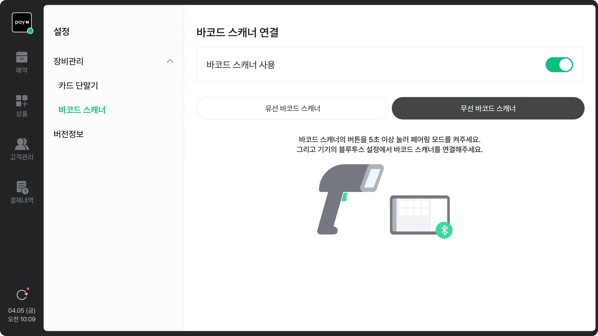 무선 바코드 스캐너 : 스캐너의 버튼을 5초 이상 누르고, 태블릿의 블루투스 설정에서 바코드 스캐너를 연결해 주세요.