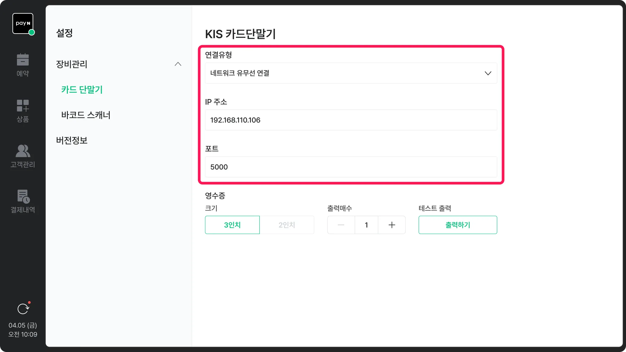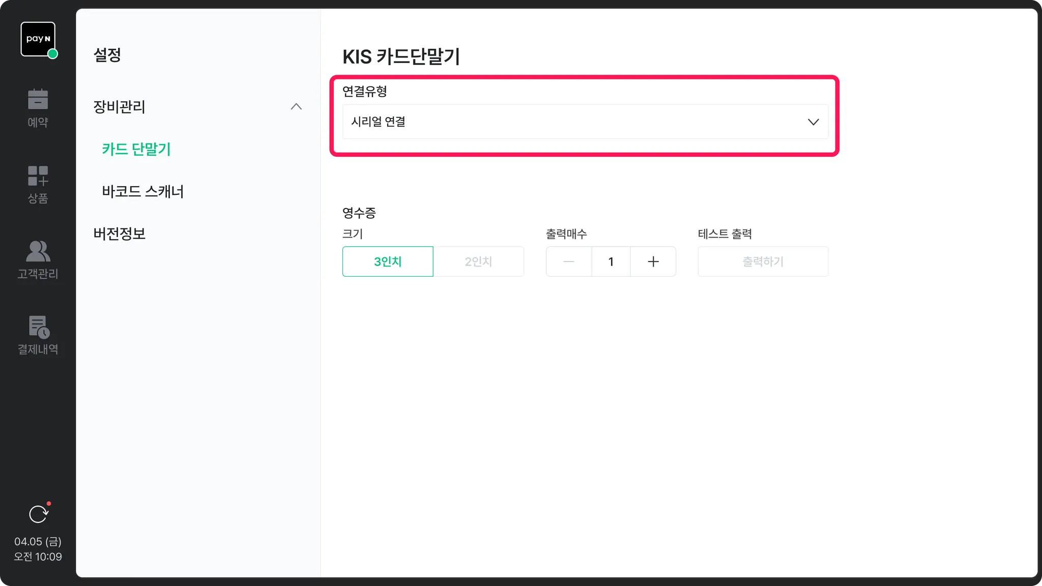 [장비관리] > [카드 단말기]에서 연결유형을 선택 후, 정보를 입력해 주세요.