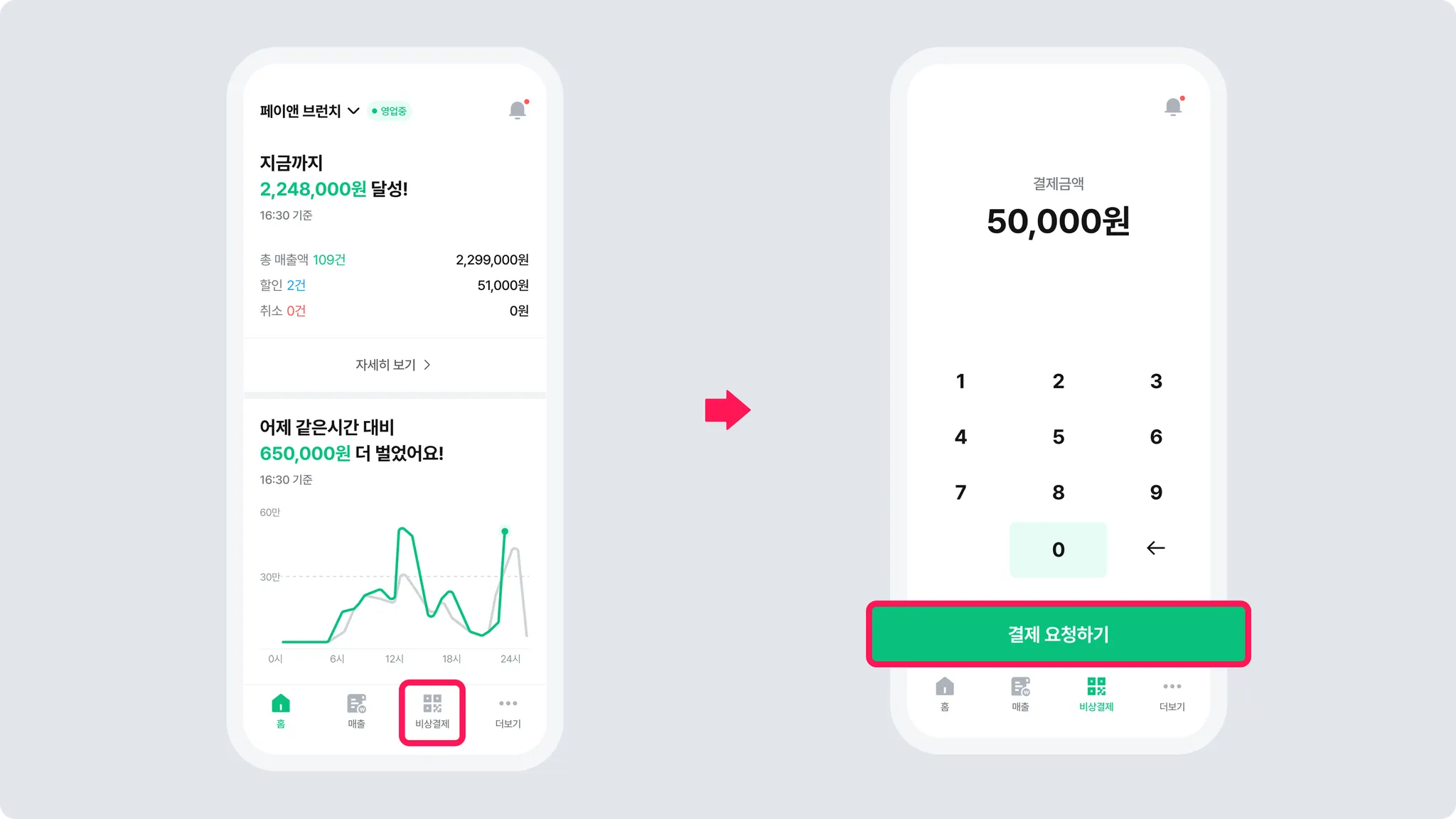 [홈] > [비상결제]에서 결제금액을 입력한 후, [결제 요청하기]를 누르면 QR코드가 생성돼요.