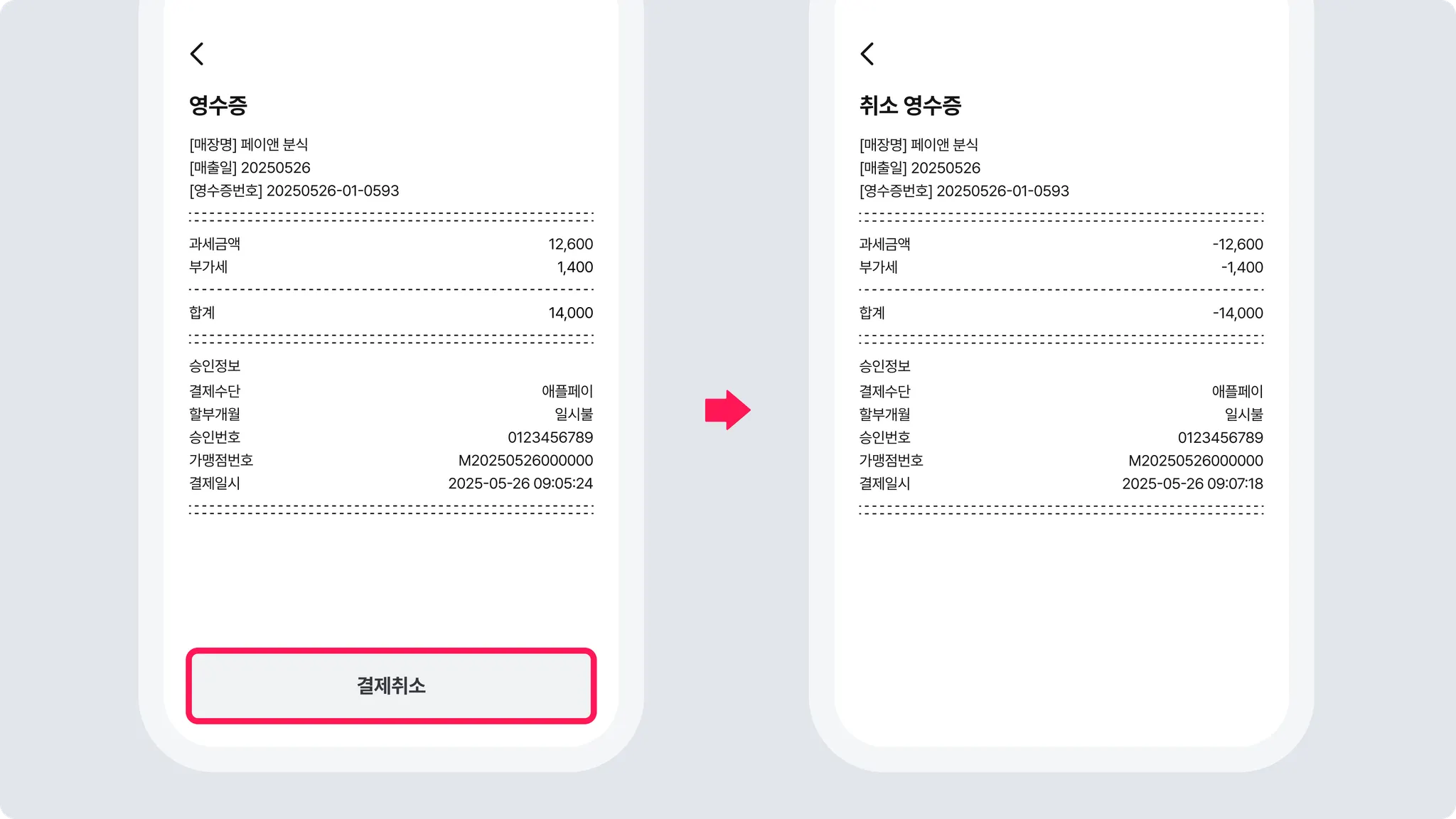 영수증 하단 [결제취소]를 누르면 취소가 완료돼요.