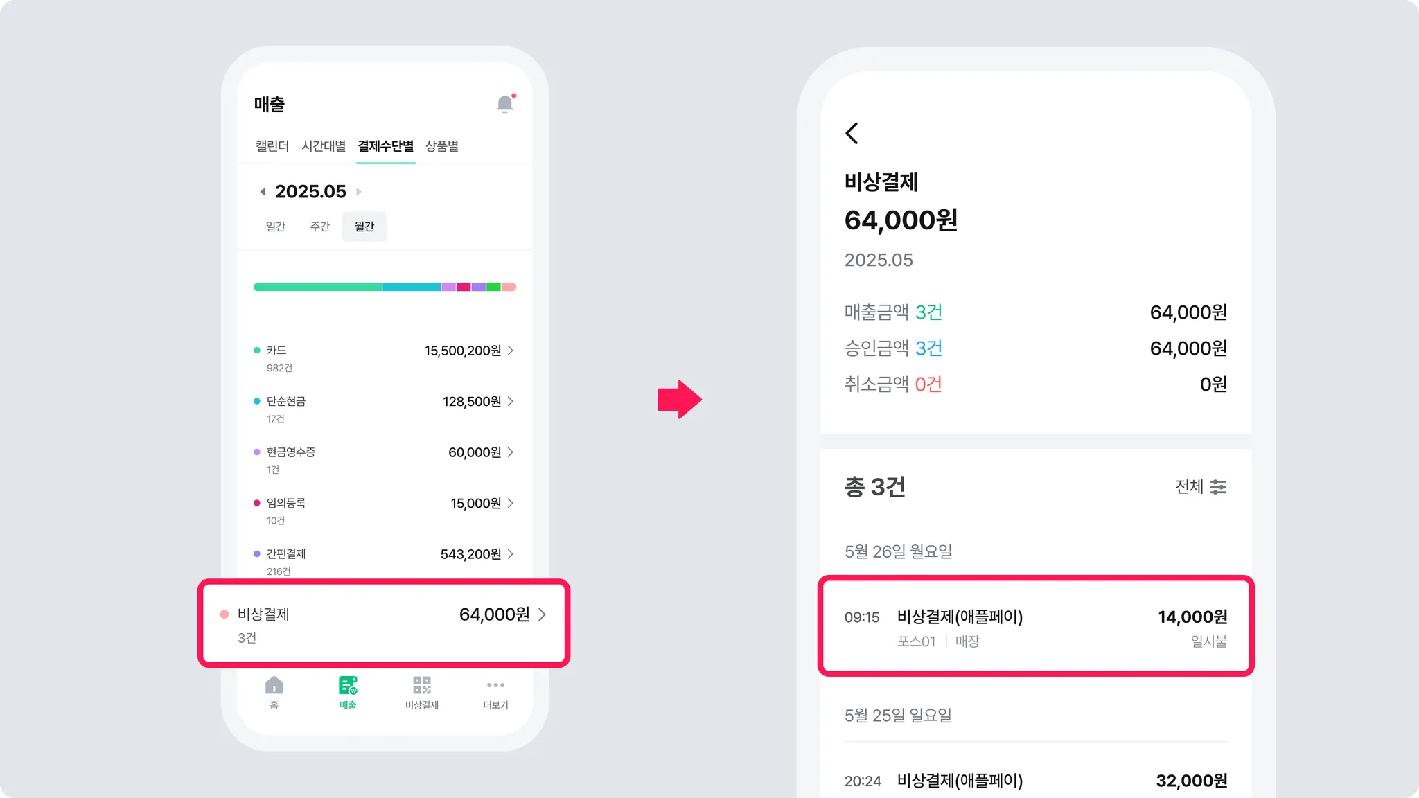 [매출] > [비상결제]에서 결제취소가 필요한 건을 선택해 주세요.