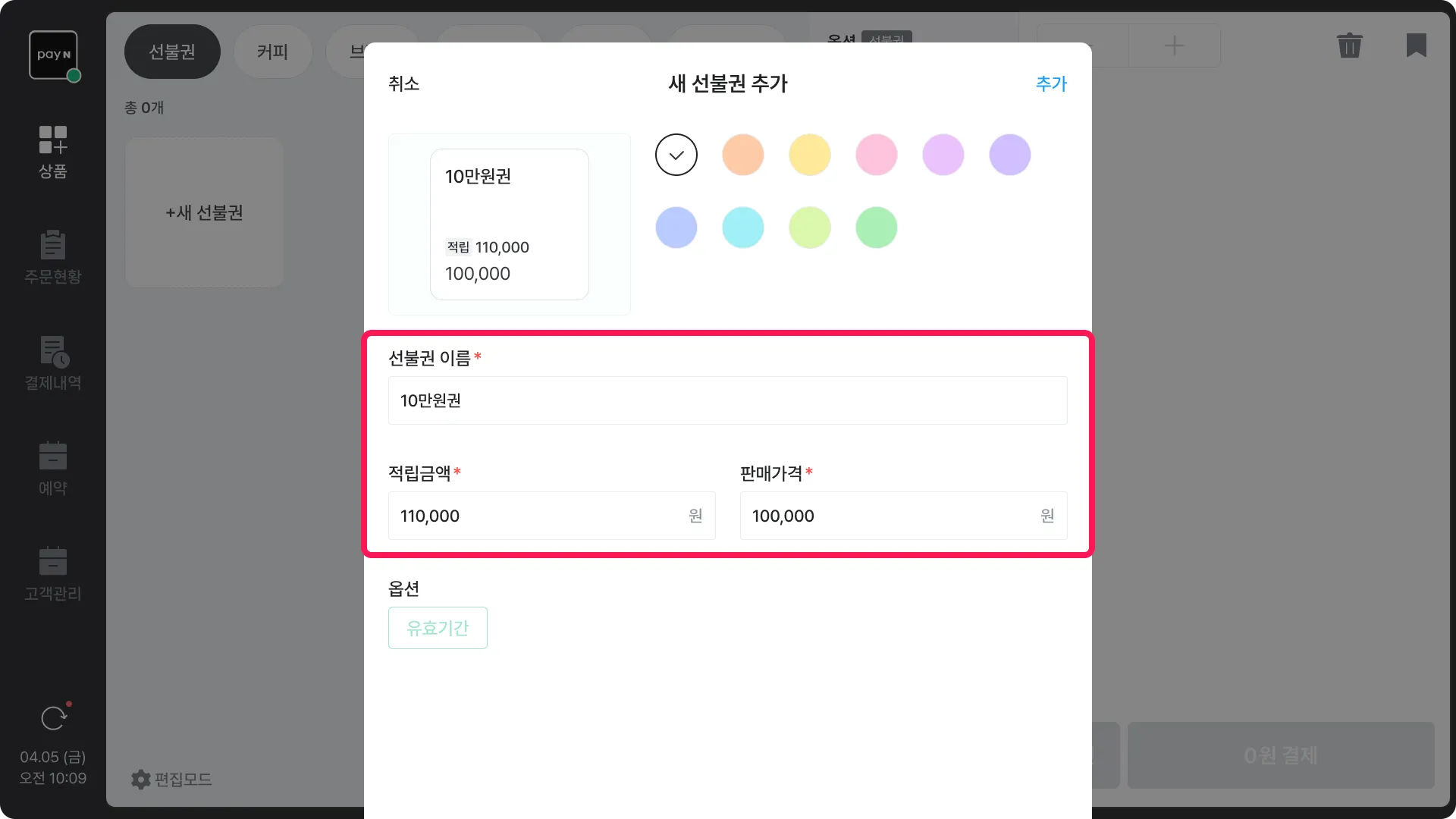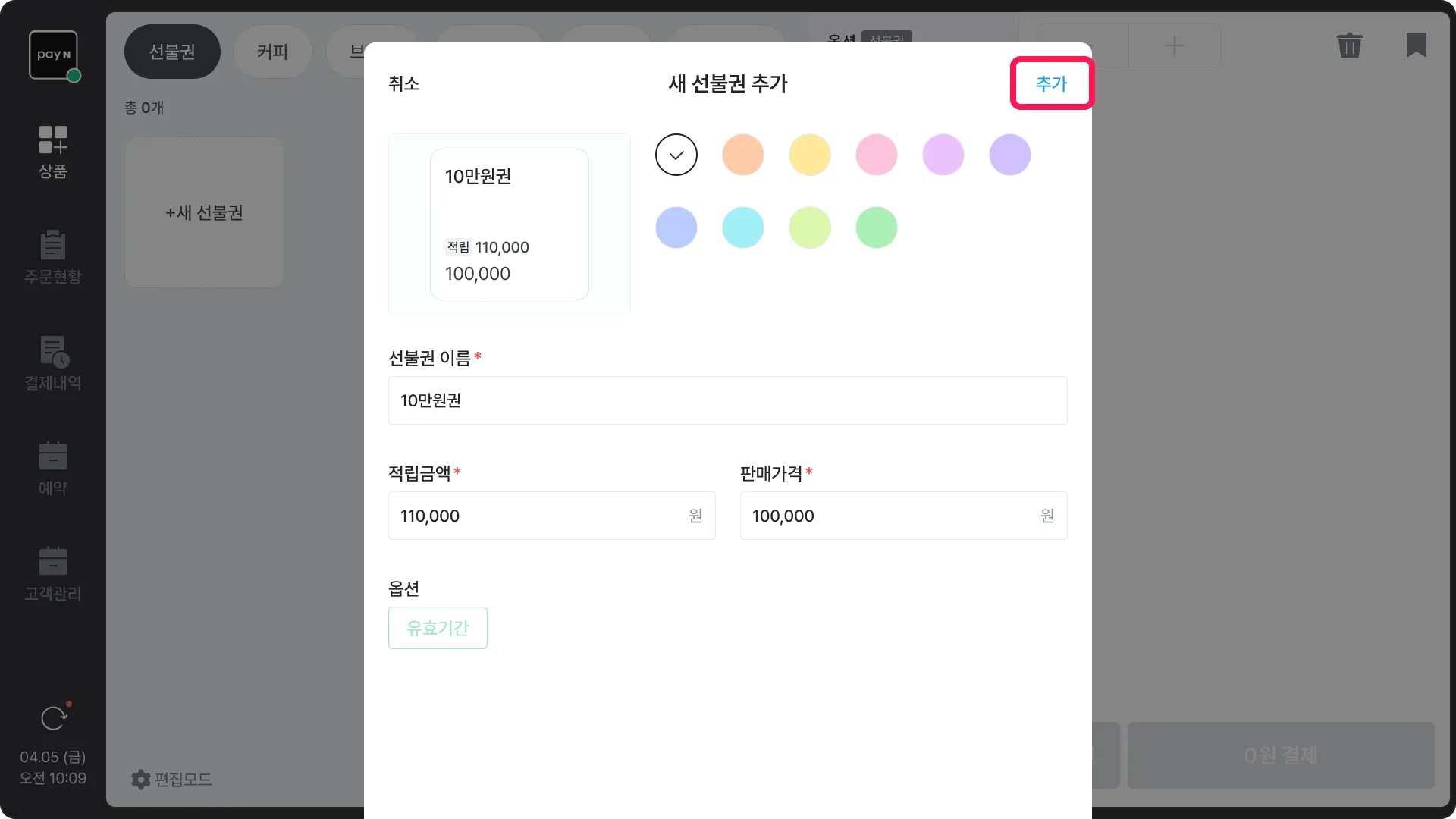 입력을 마친 후, [추가]를 눌러주세요.선불권 수정/삭제