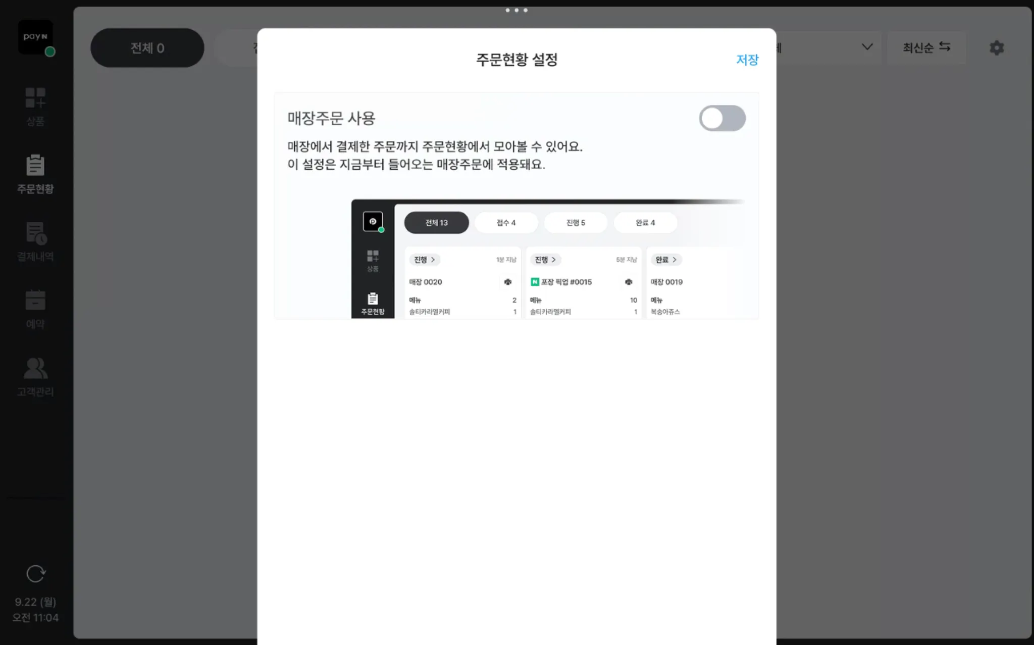 4-2. 토글키를 ON/OFF 설정하여 매장주문을 주문현황판에서 설정할 수 있어요.