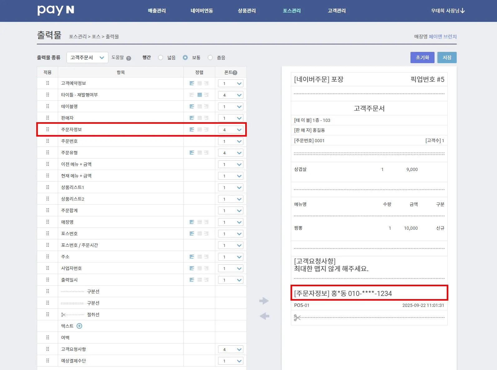 외부 주문(예: 네이버 주문)의 경우 고객 번호 뒷자리를 포함해 출력할 수 있어요!