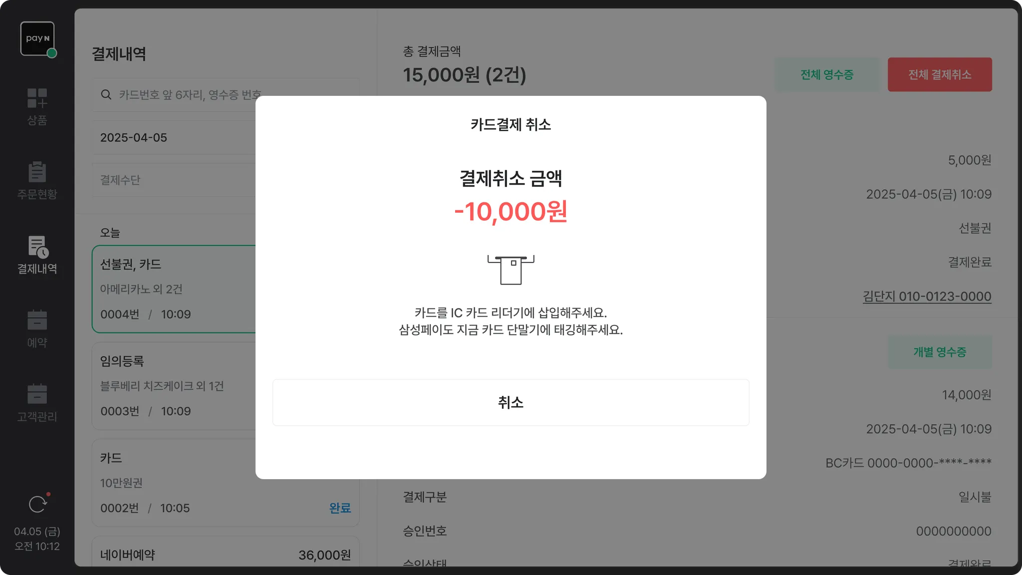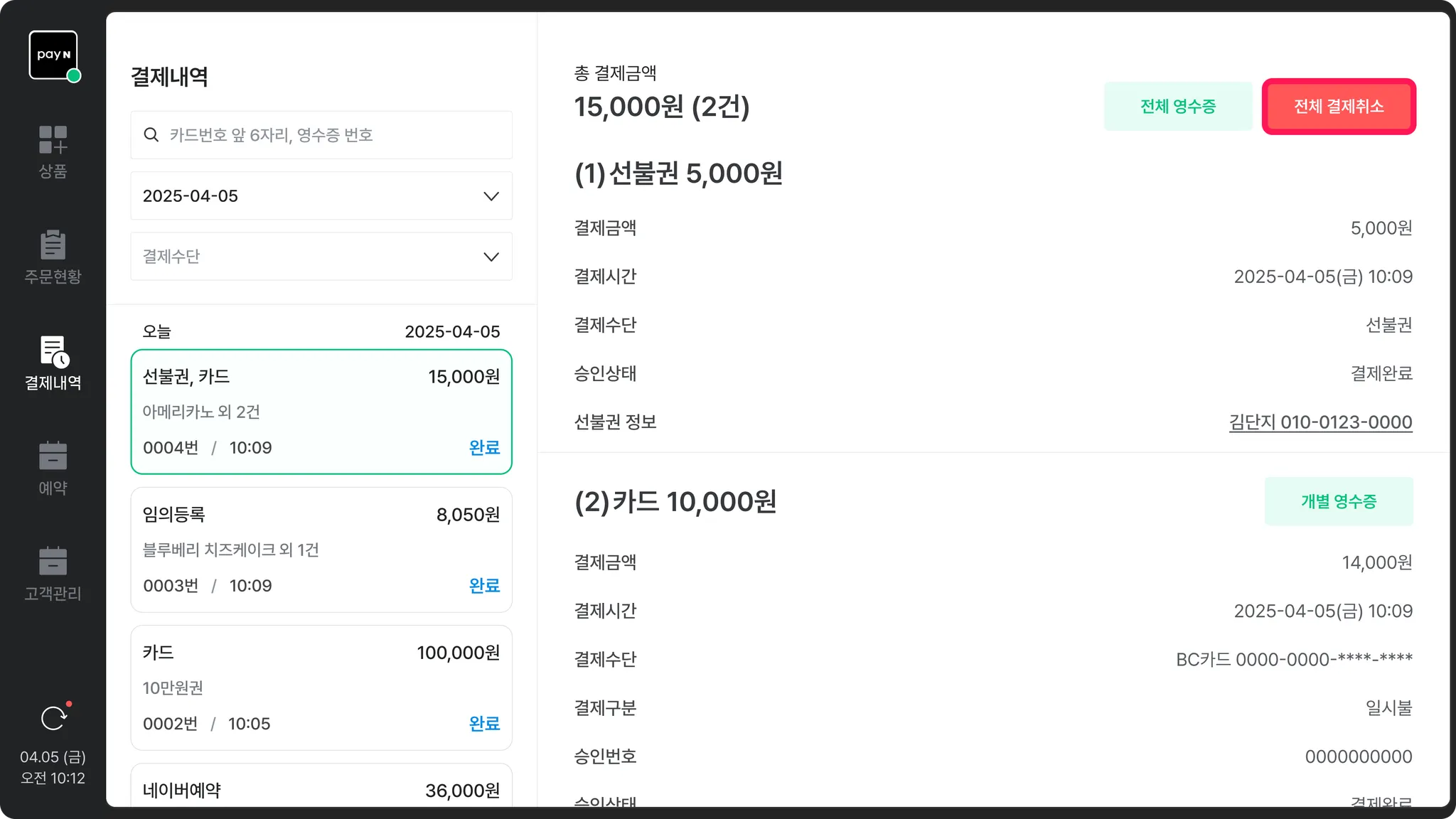 결제내역에서 선불권이 포함된 결제 내역을 선택 후, [전체 결제취소]를 눌러주세요.