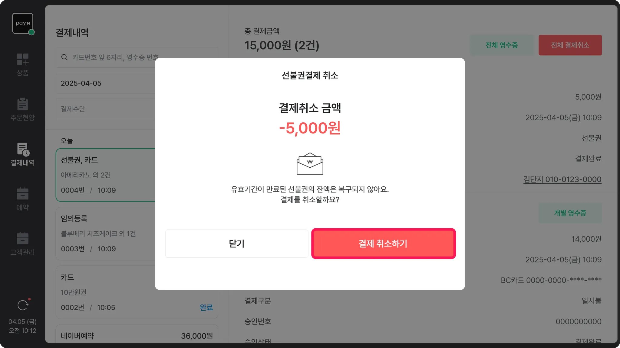 결제취소 시, 유효기간이 만료된 선불권의 잔액은 복구되지 않는 점 유의해 주세요.