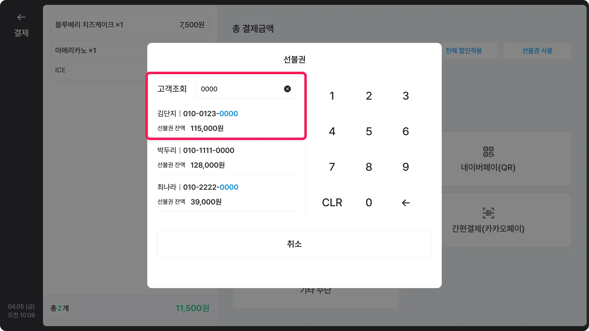 고객의 휴대폰 번호 끝 4자리를 입력하여, 선불권을 사용할 고객을 선택해 주세요.