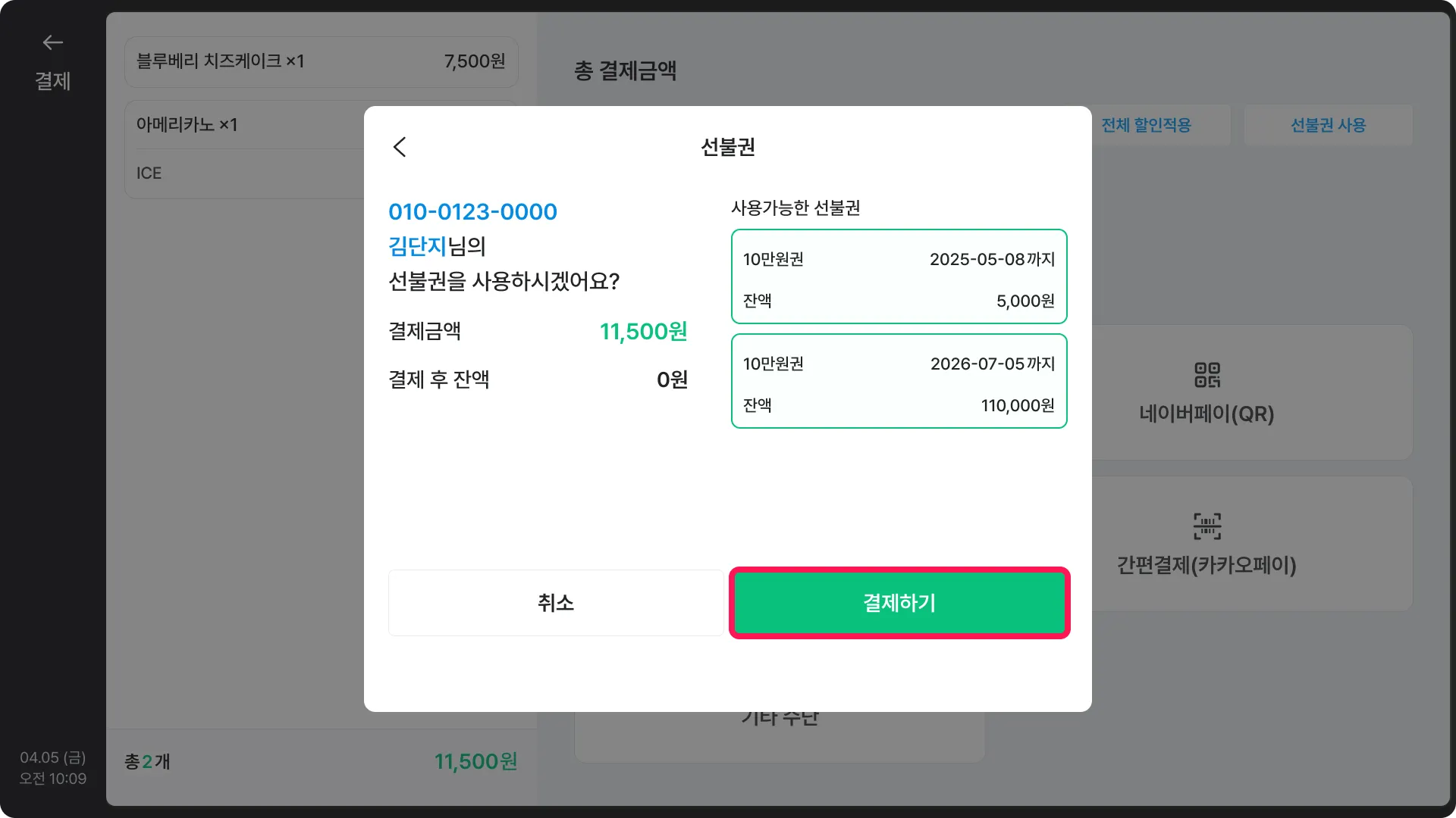 고객을 선택한 후, [확인]을 눌러 결제를 완료해 주세요.