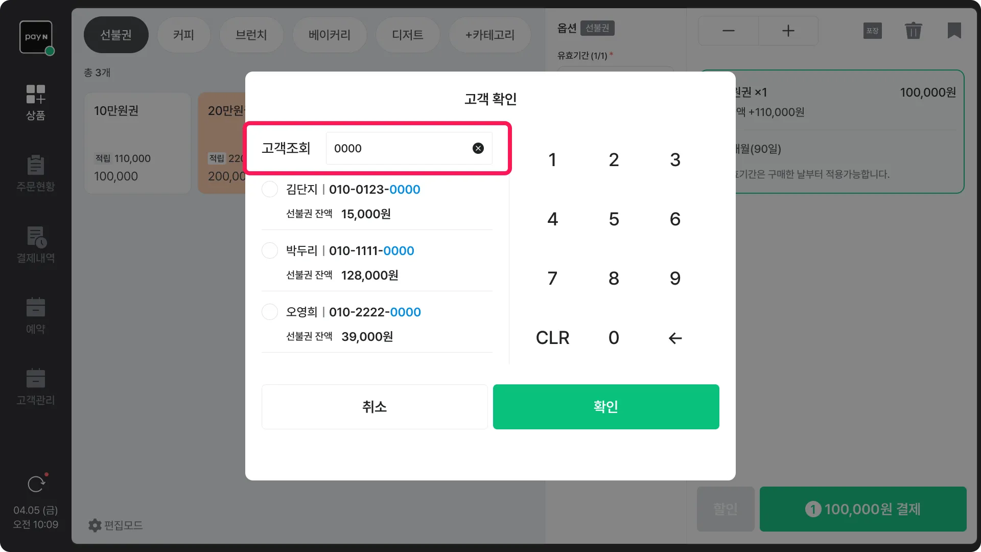 고객관리에서 [선불권] > [선불권 구매]를 통해 구매 시, 고객조회가 한 번 더 필요해요.