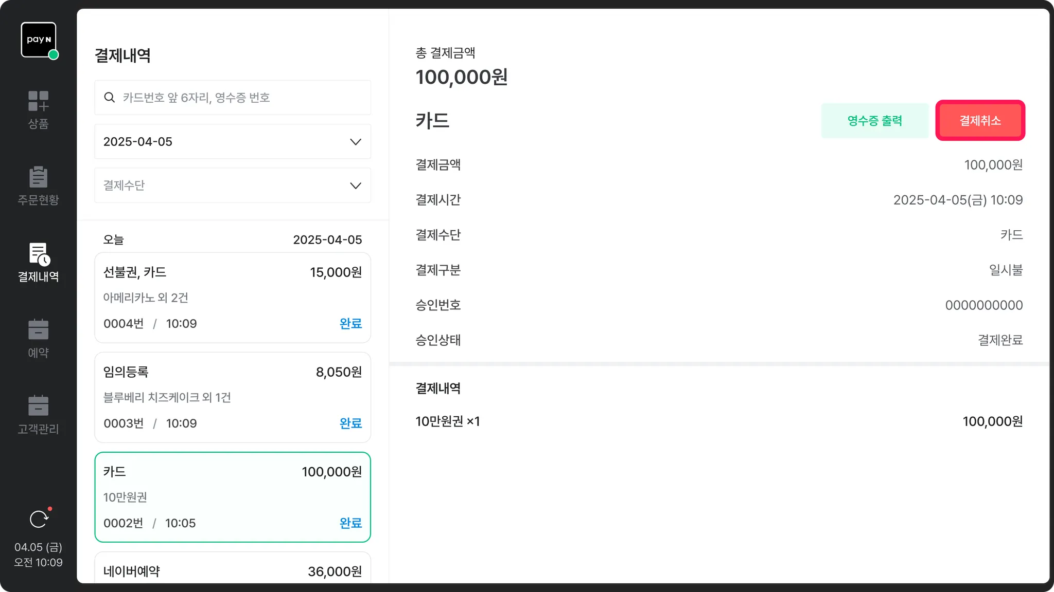 결제내역에서 선불권을 결제한 내역을 선택 후, [결제취소]를 눌러주세요.