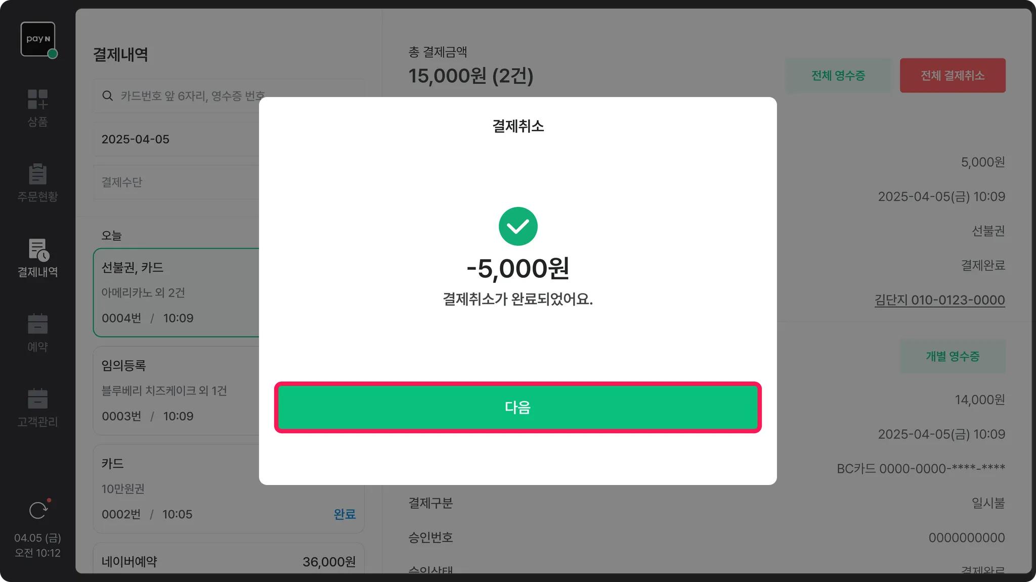 결제수단별로 취소되기 때문에, [다음]을 눌러 나머지 결제내역을 취소해 주세요.