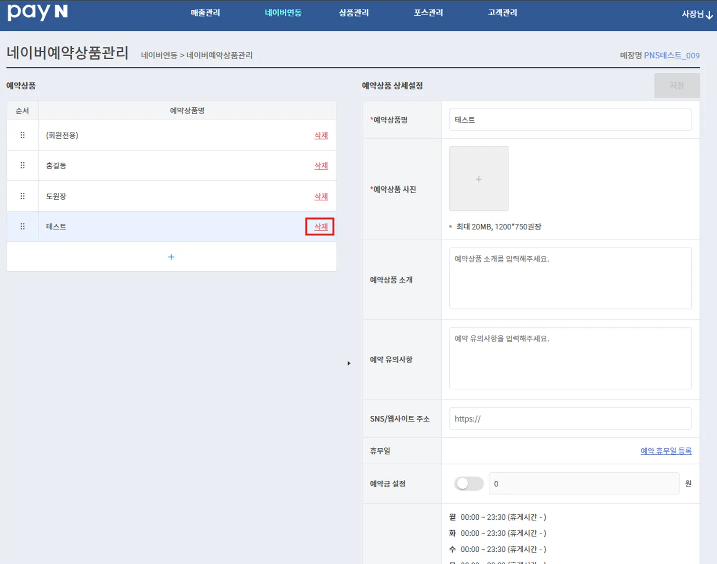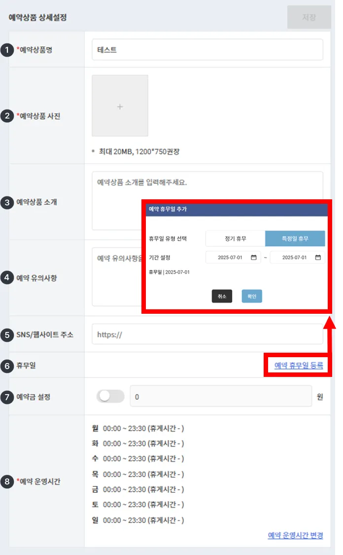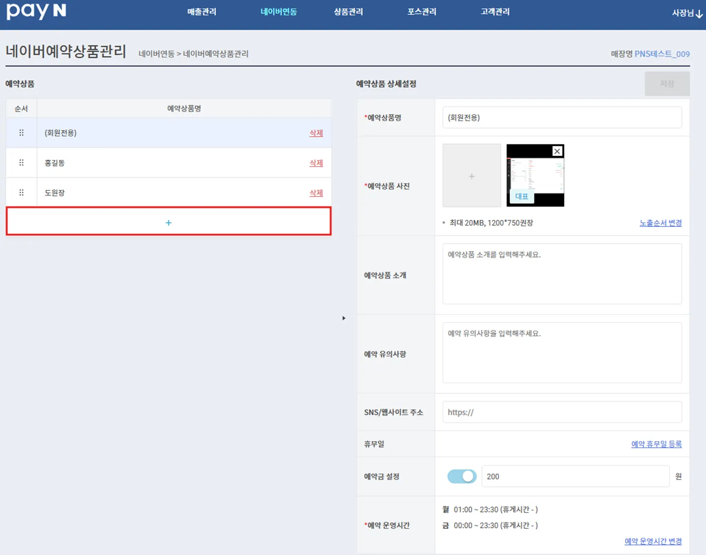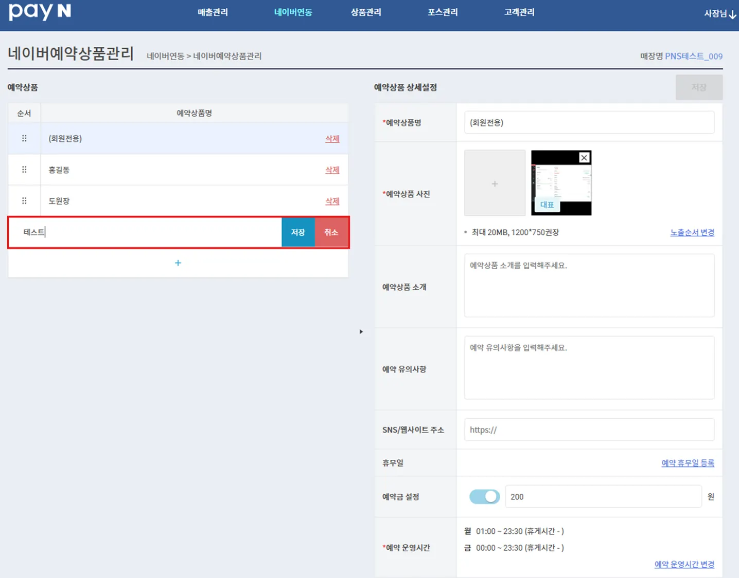예약 상품명을 입력 후, [저장]을 누르면 예약 상품이 추가돼요.