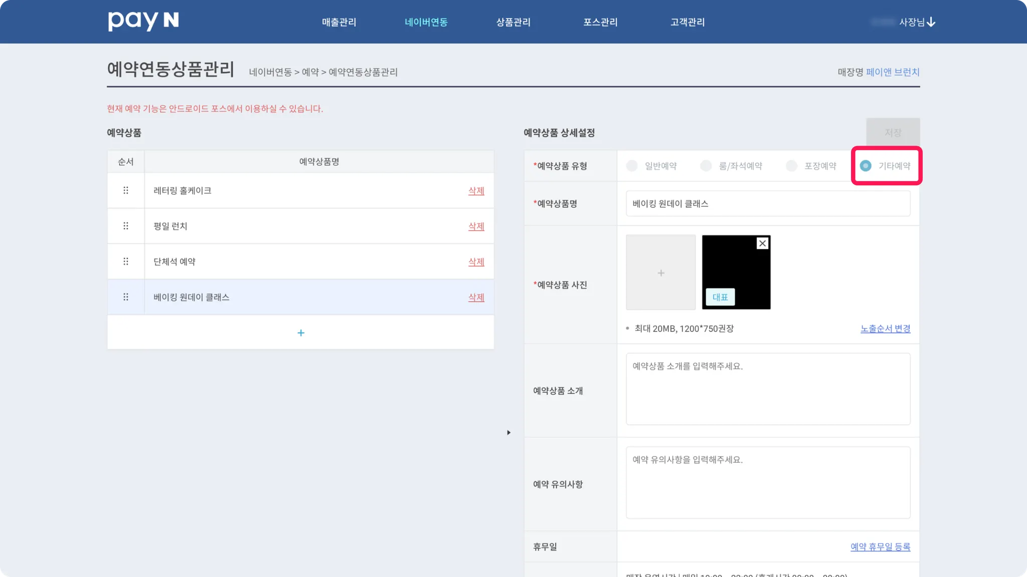 [네이버 연동] > [네이버 예약 설정]에서 예약 상품과 포스 상품을 연결할 수 있어요.