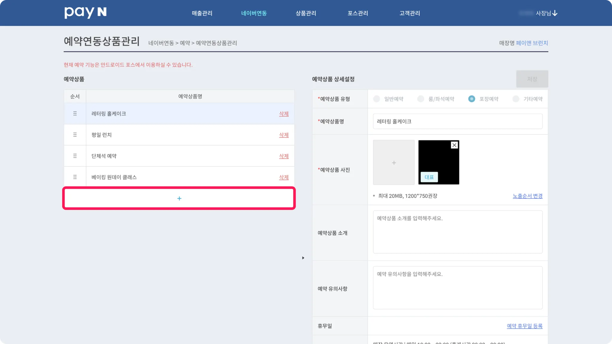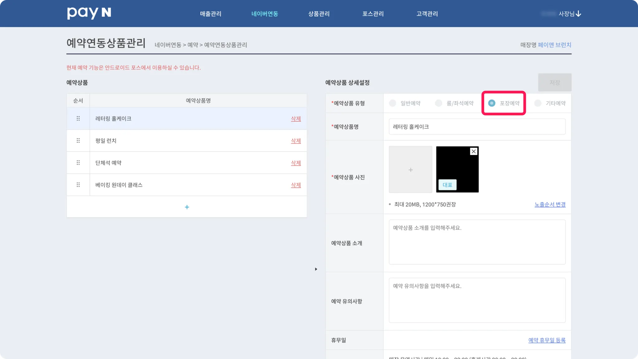 포장 예약은 네이버 예약 노출 활성화를 위해 상품 연결이 필수에요.•