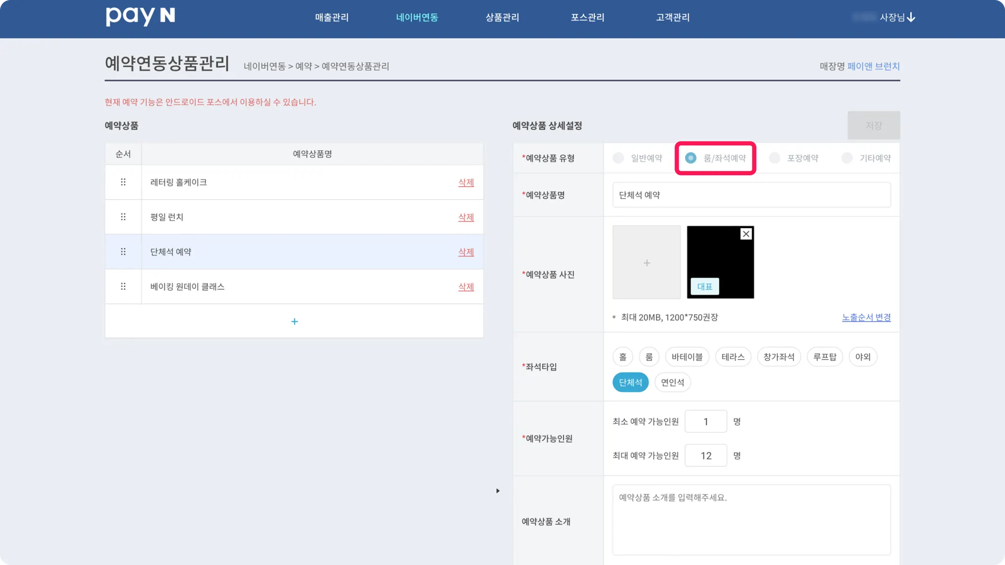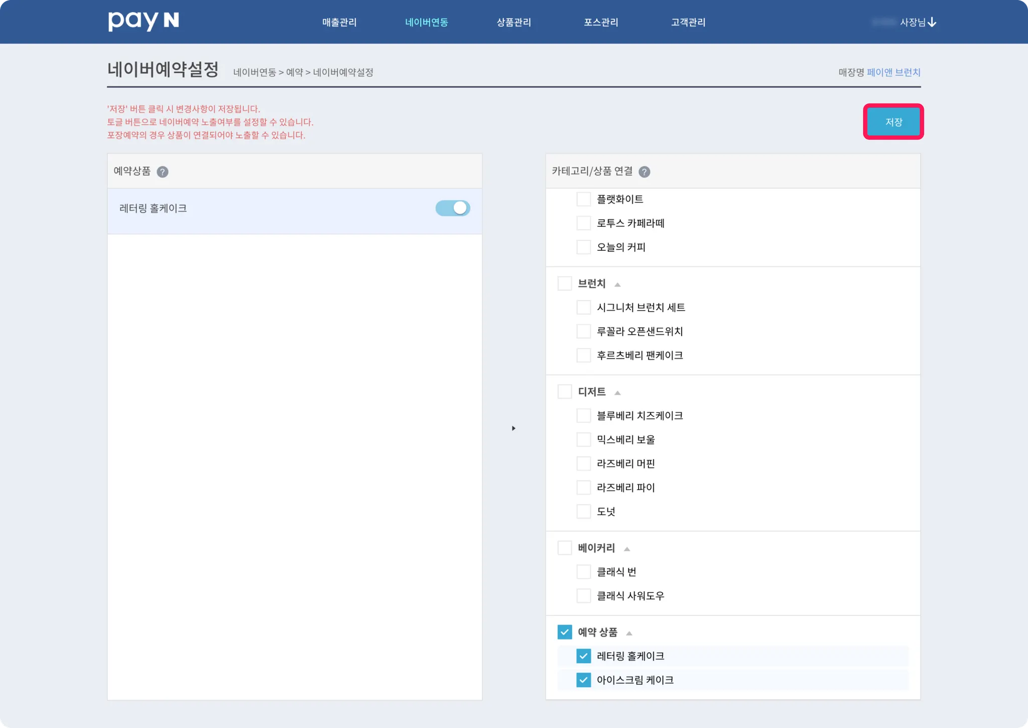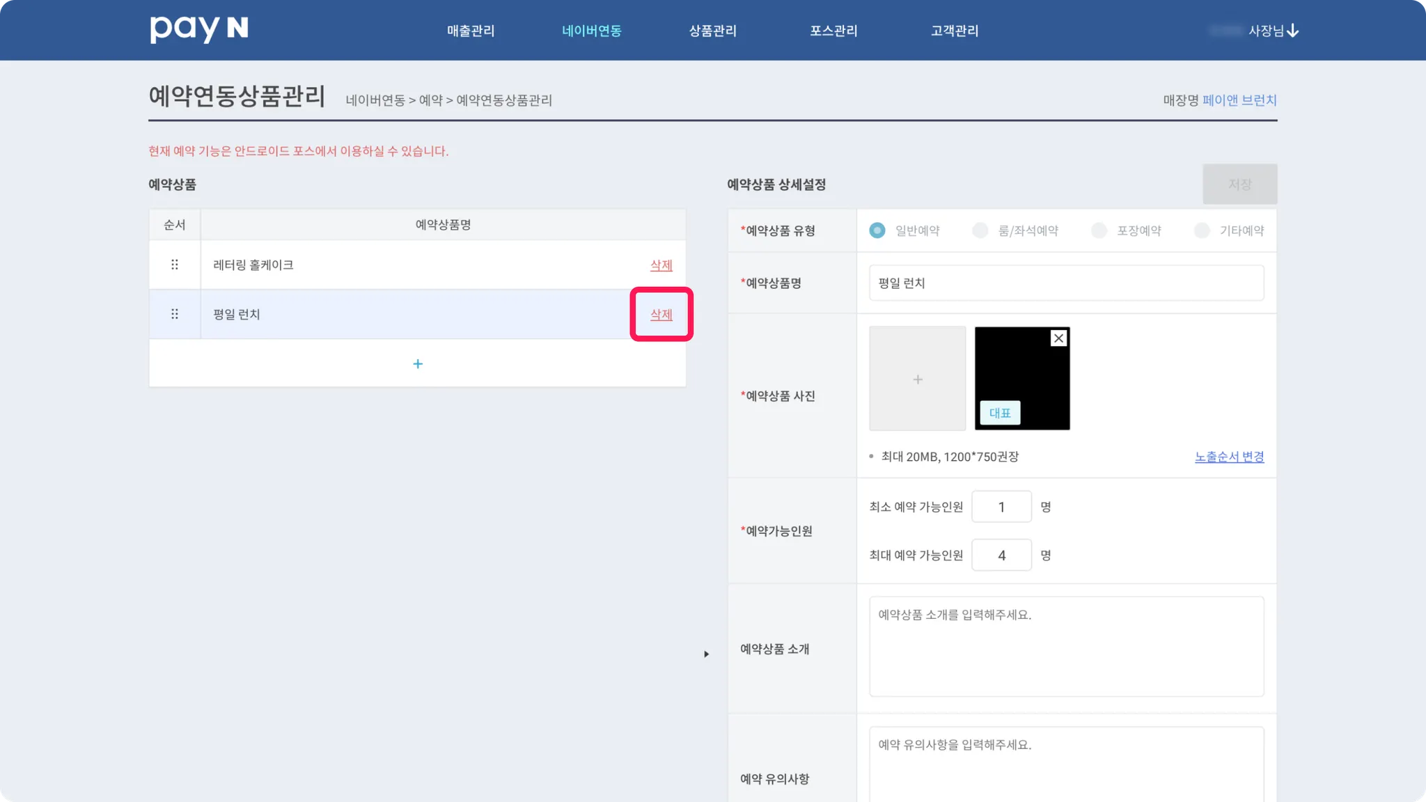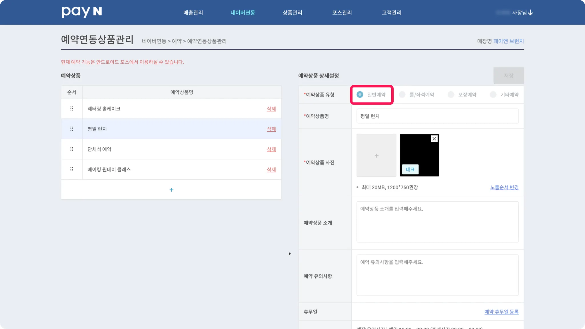[네이버 연동] > [네이버 예약 설정]에서 예약 상품과 포스 상품을 연결할 수 있어요.