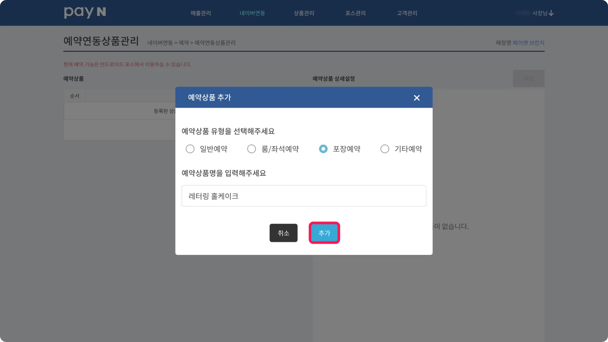 포장 예약은 네이버 예약 노출 활성화를 위해 상품 연결이 필수에요.•