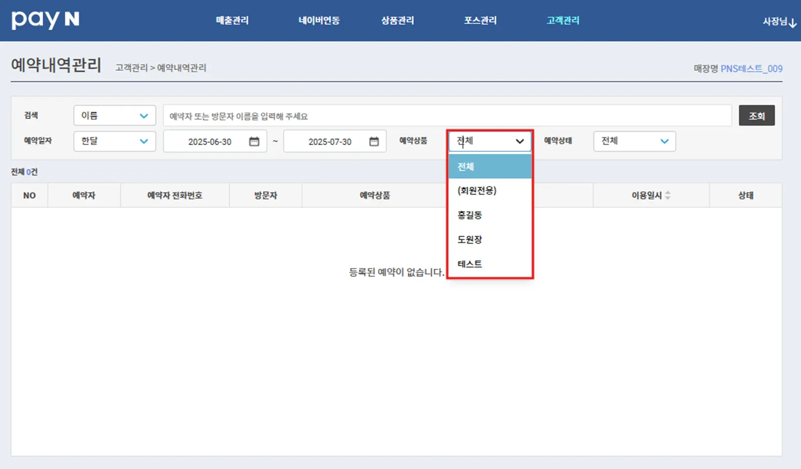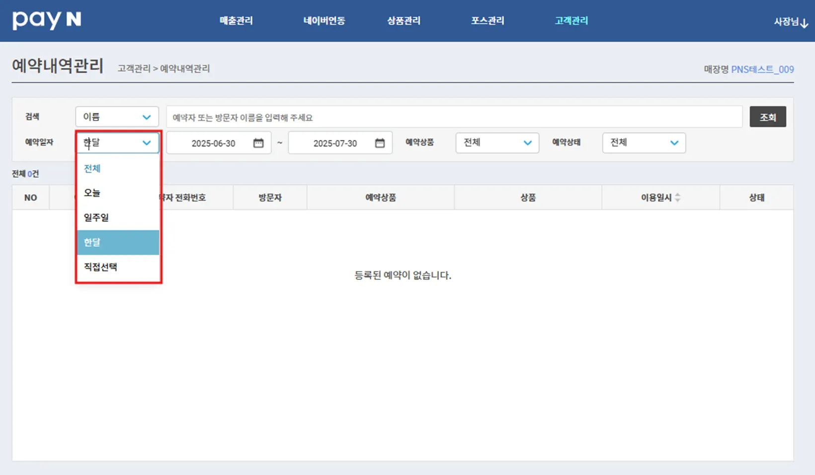 예약일자 검색 : 예약일자를 선택하여, 해당 일자/기간 내 방문한 고객을 확인할 수 있어요.