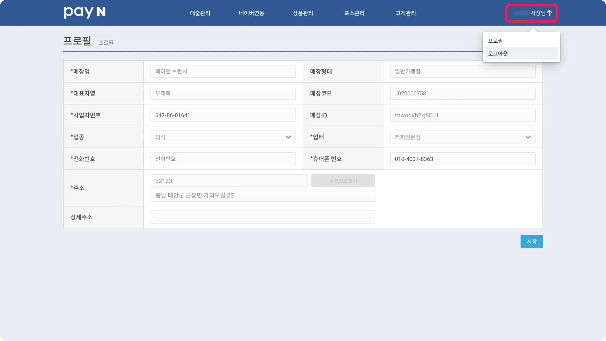 페이앤 포스에서 로그인하는 네이버 아이디와 동일한 정보로 로그인해요.