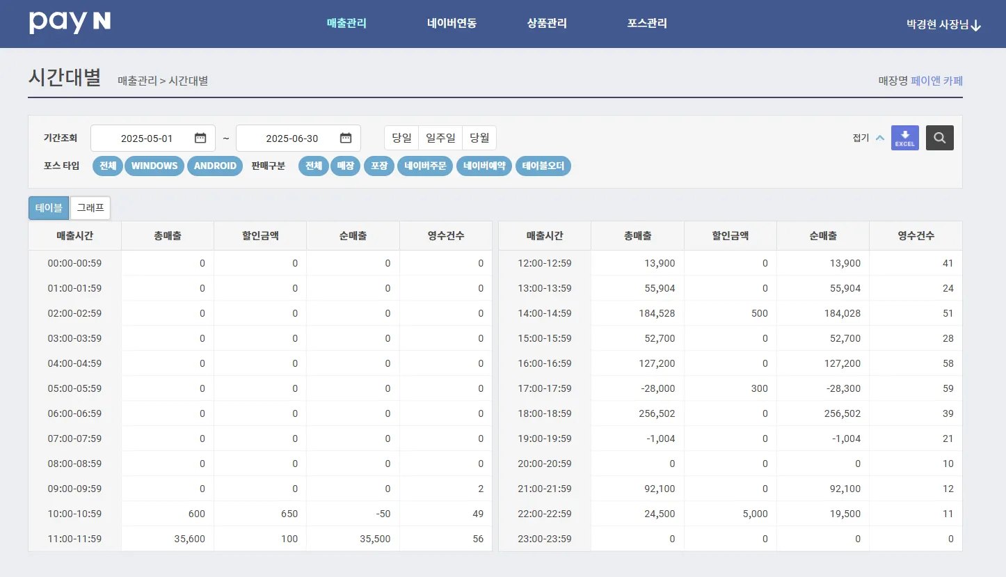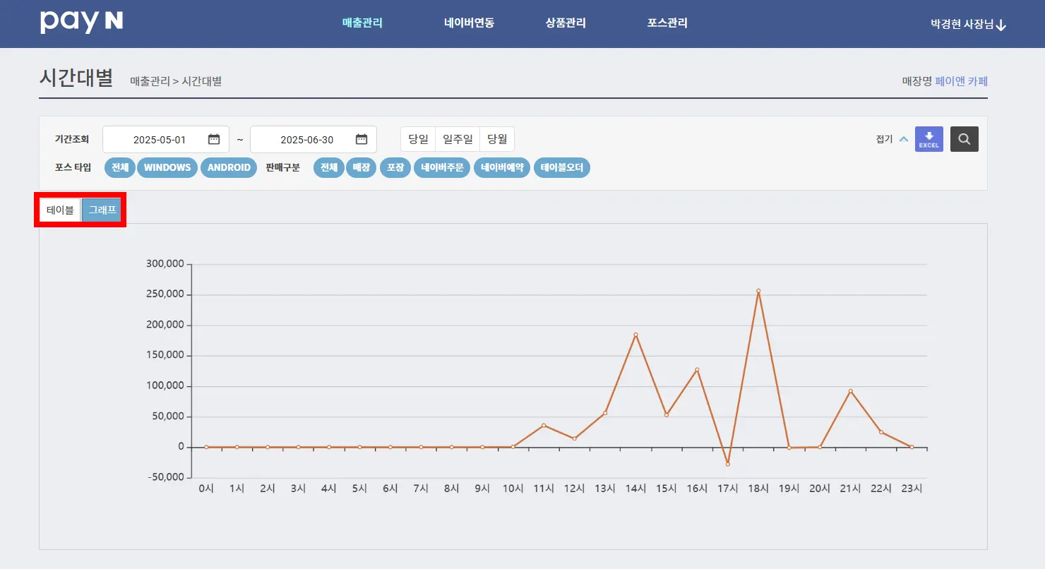 [매출 관리] > [시간대별]에서 시간대별 매출을 확인할 수 있어요.