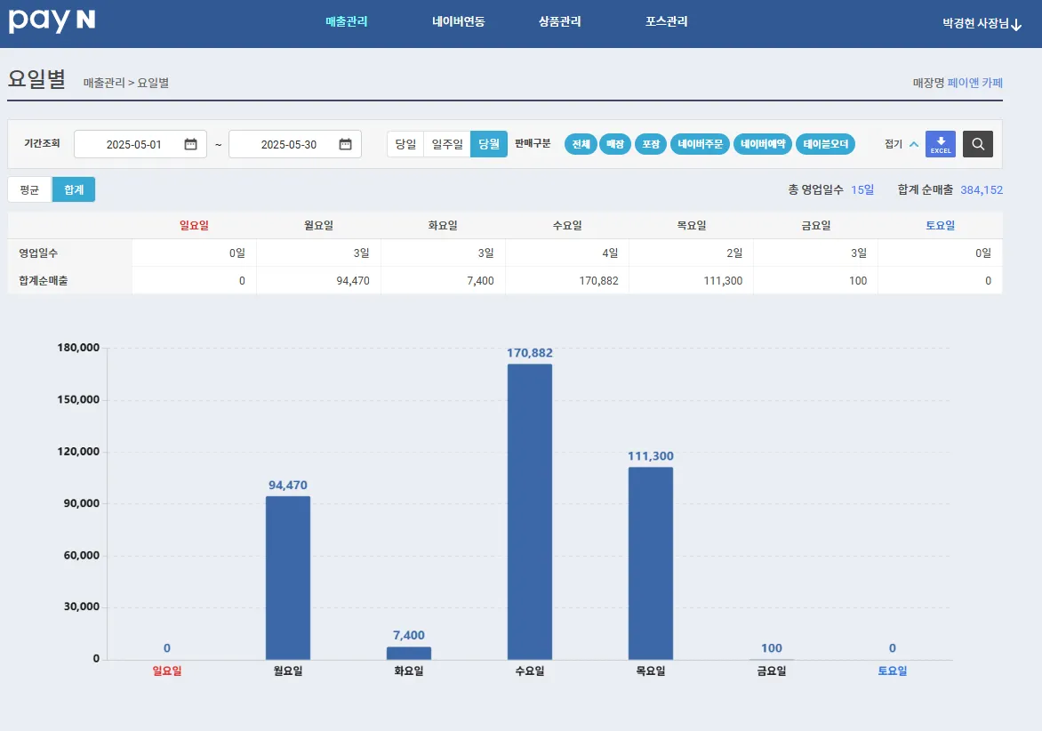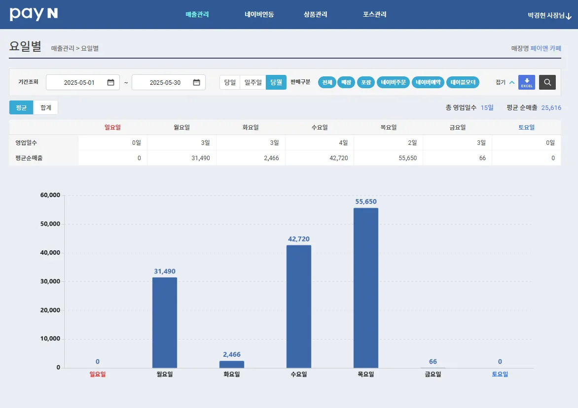 [매출 관리] > [요일별]에서 원하는 기간의 요일별 합계 및 평균 매출을 확인할 수 있어요.