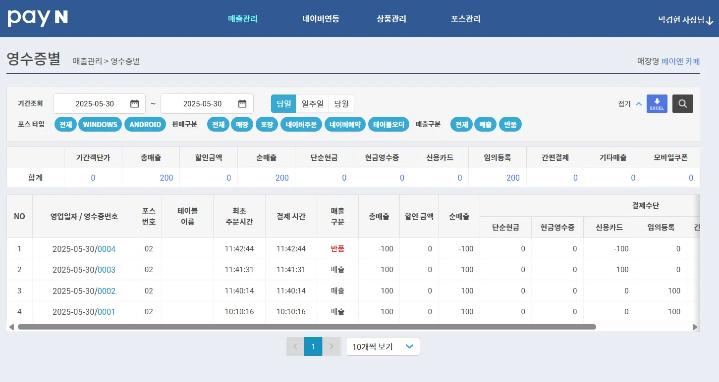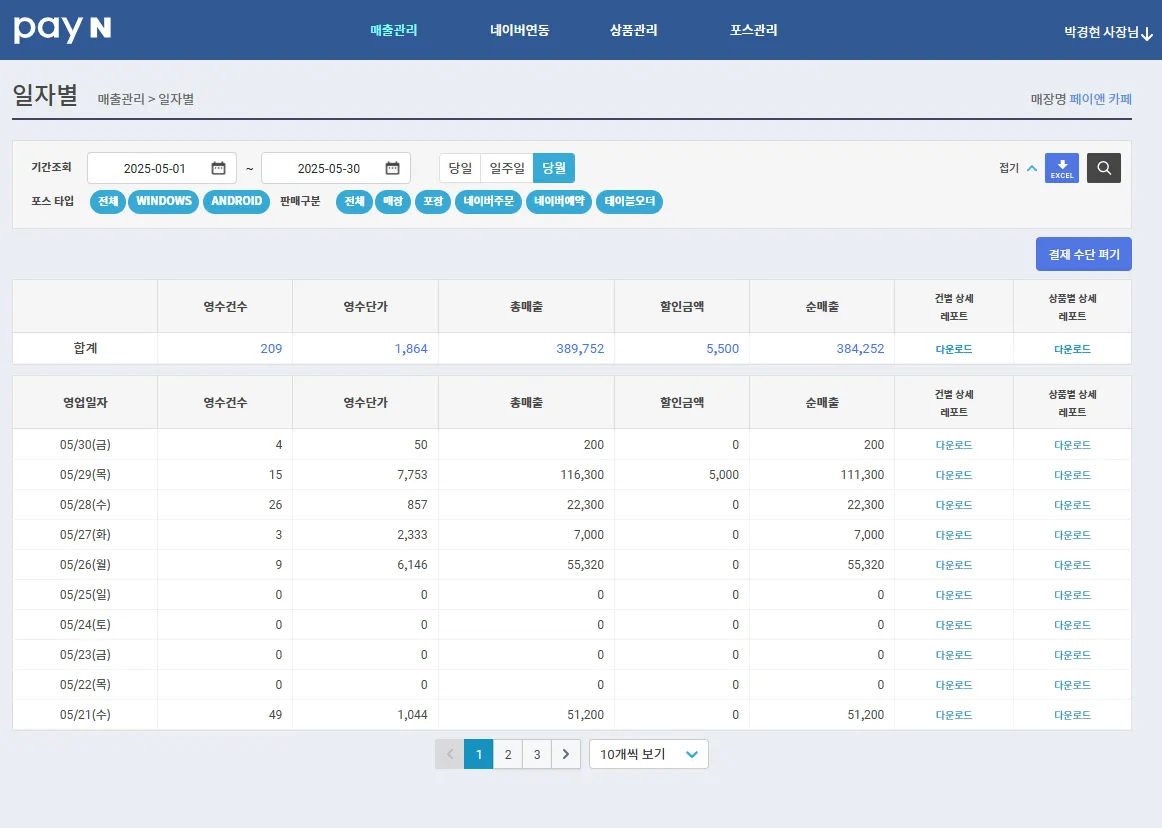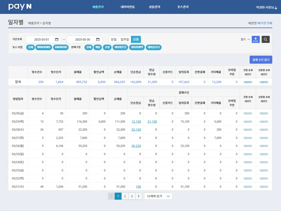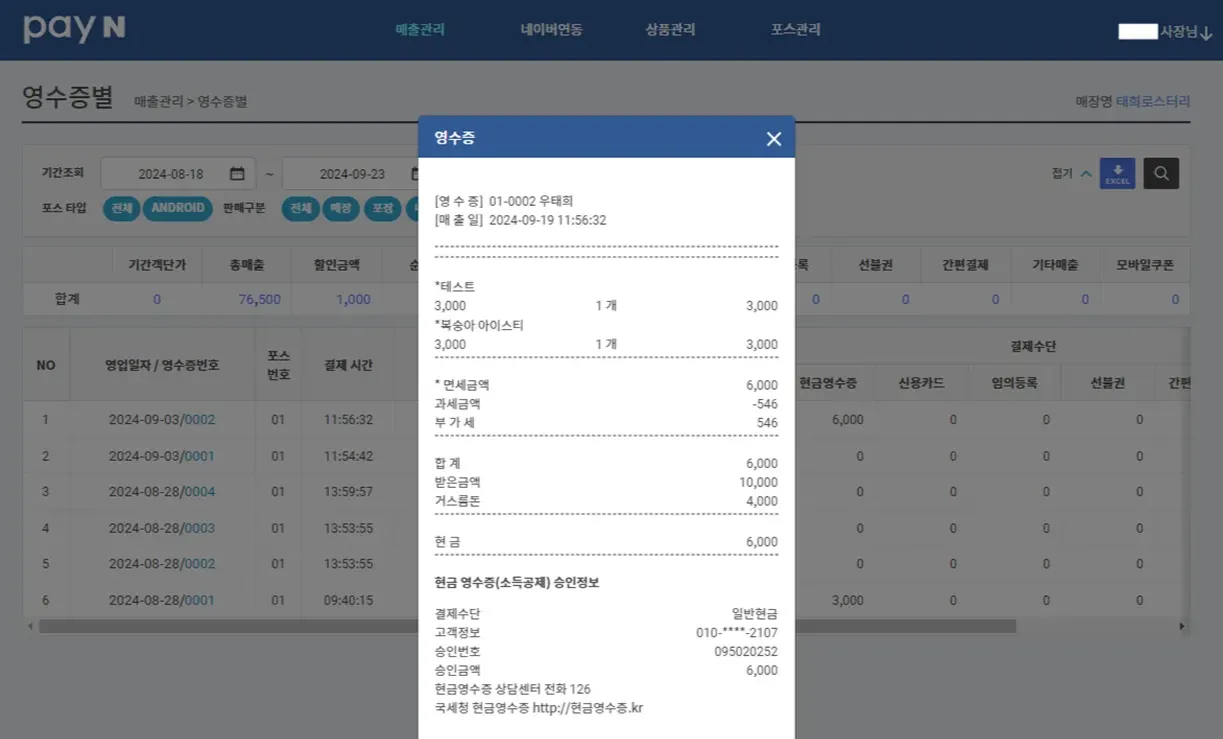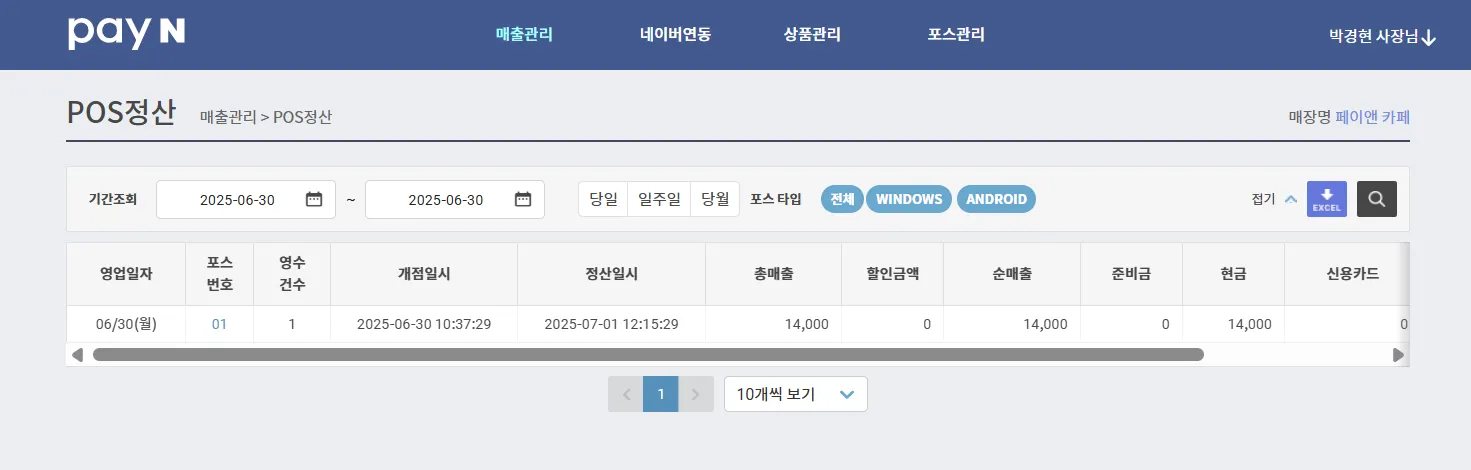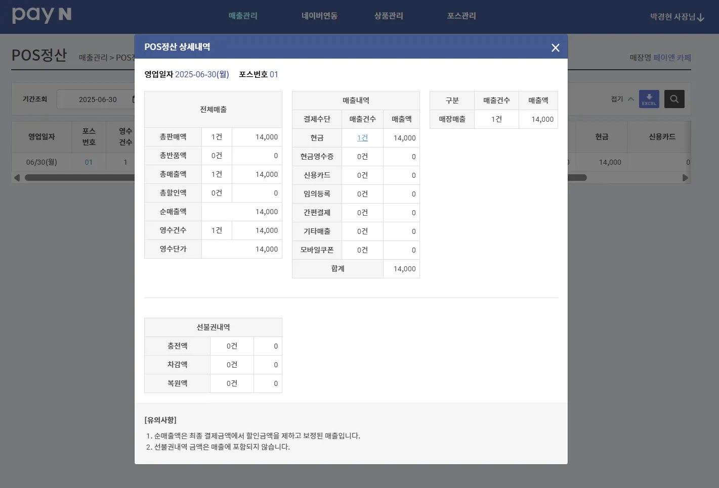 포스 번호를 누르면 해당 영업일자의 POS 정산 상세내역을 확인할 수 있어요.