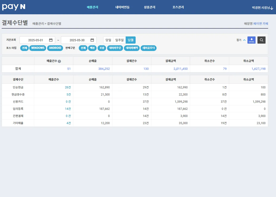 [매출 관리] > [결제수단별]에서 결제수단별 매출을 확인할 수 있어요.