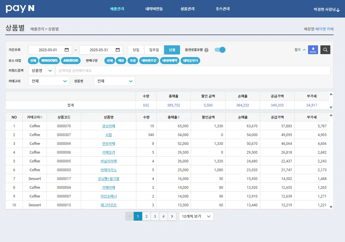 [매출 관리] > [상품별]에서 상품별 매출을 확인할 수 있어요.