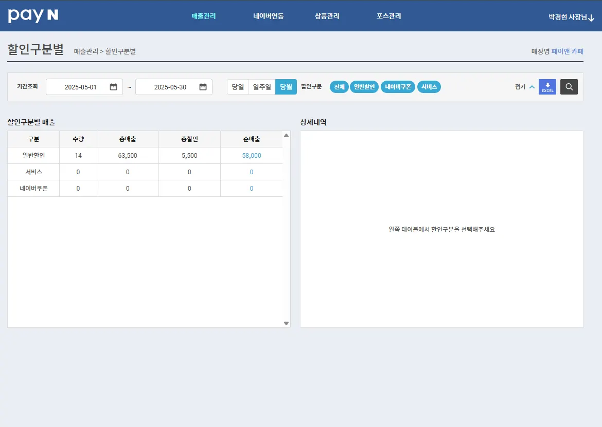 [매출 관리] > [할인구분별]에서 일반 할인, 네이버 쿠폰 할인 등이 적용된 매출을 확인할 수 있어요.