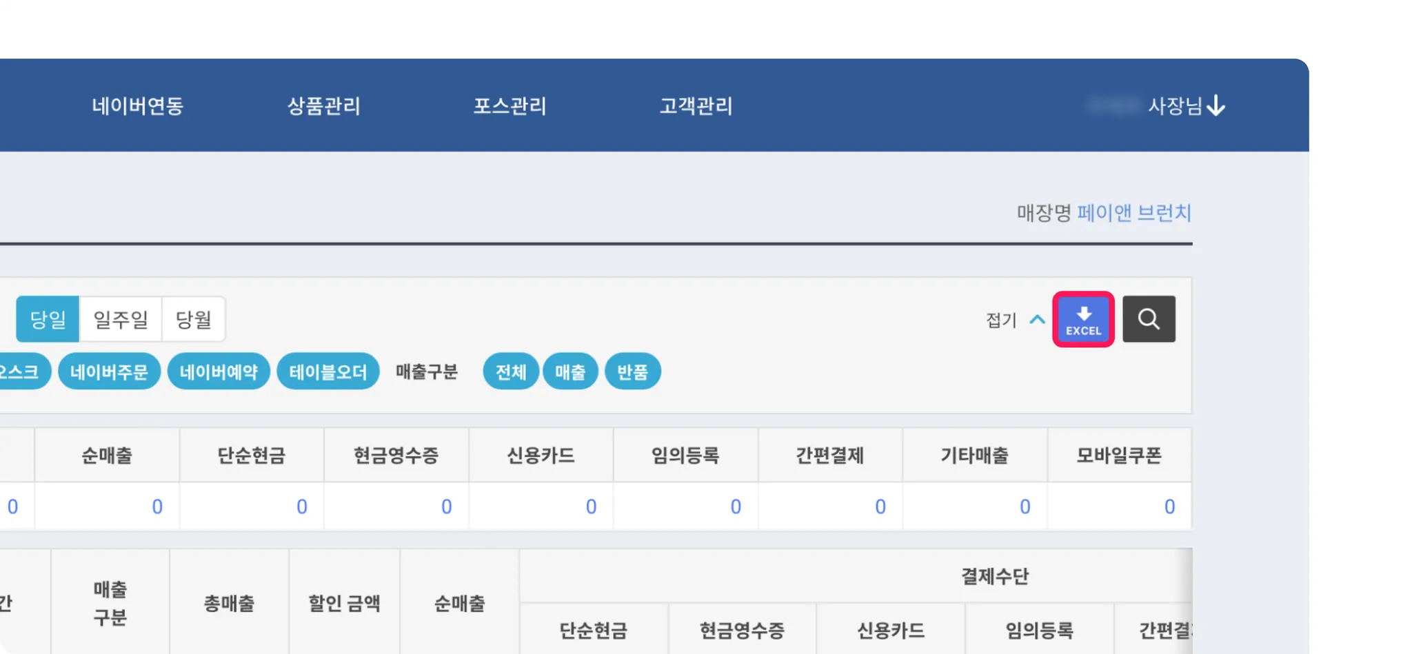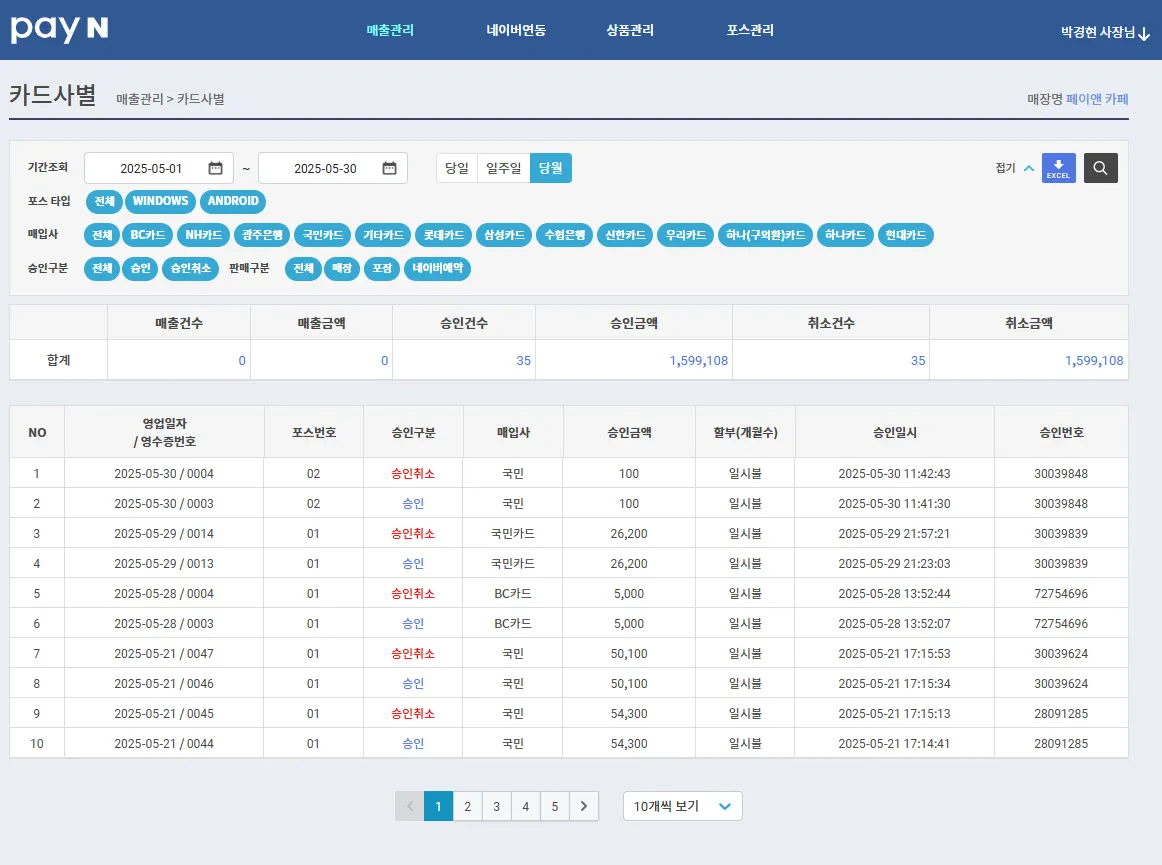 [매출 관리] > [카드사별]에서 카드사별 매출을 확인할 수 있어요.