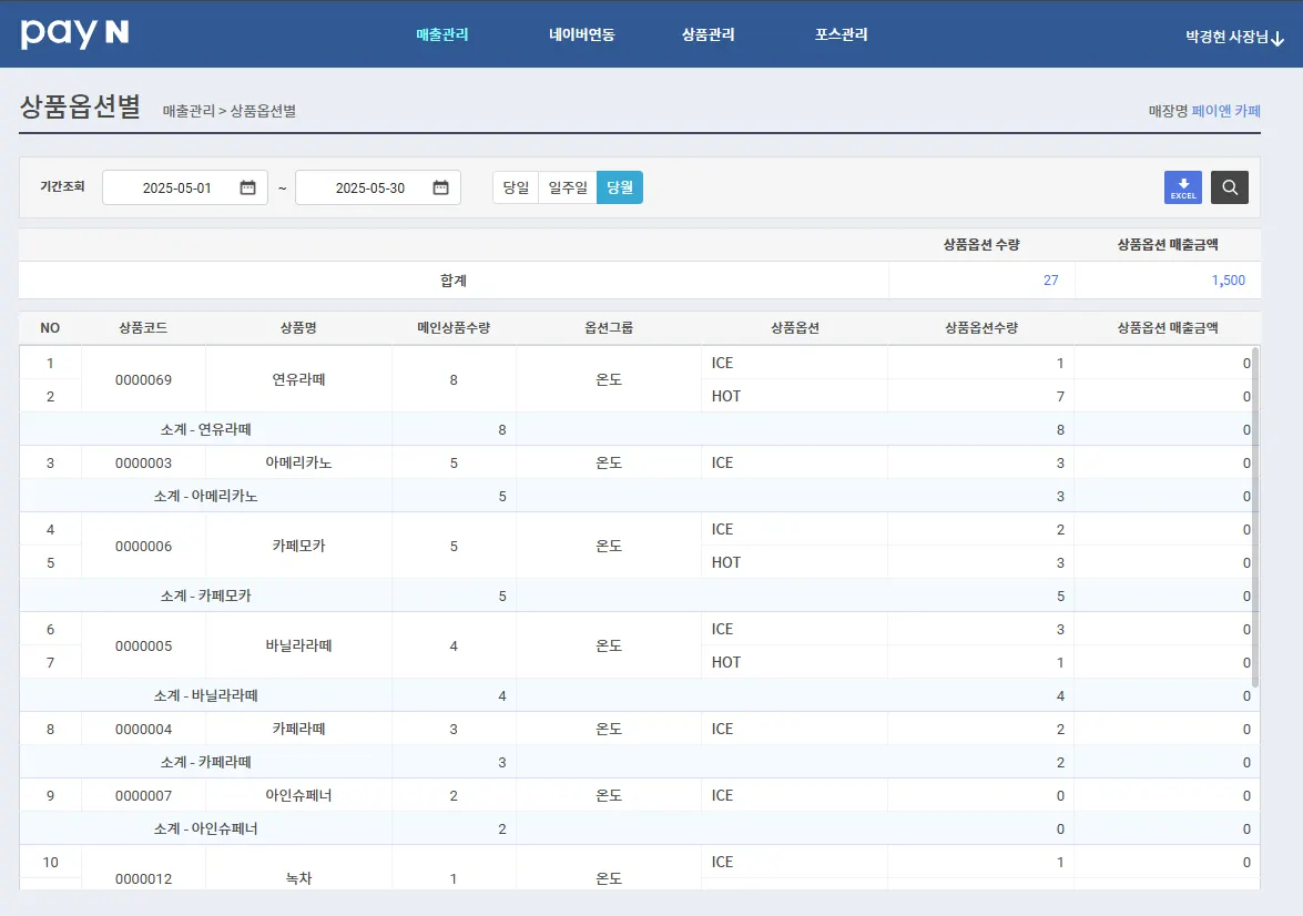 [매출 관리] > [상품옵션별]에서 상품에 적용된 옵션 항목에 대한 판매 데이터를 확인할 수 있어요.