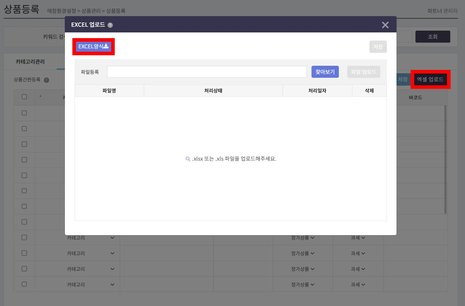 단, 엑셀 양식을 다운받기 전, 카테고리를 먼저 등록해 주세요.