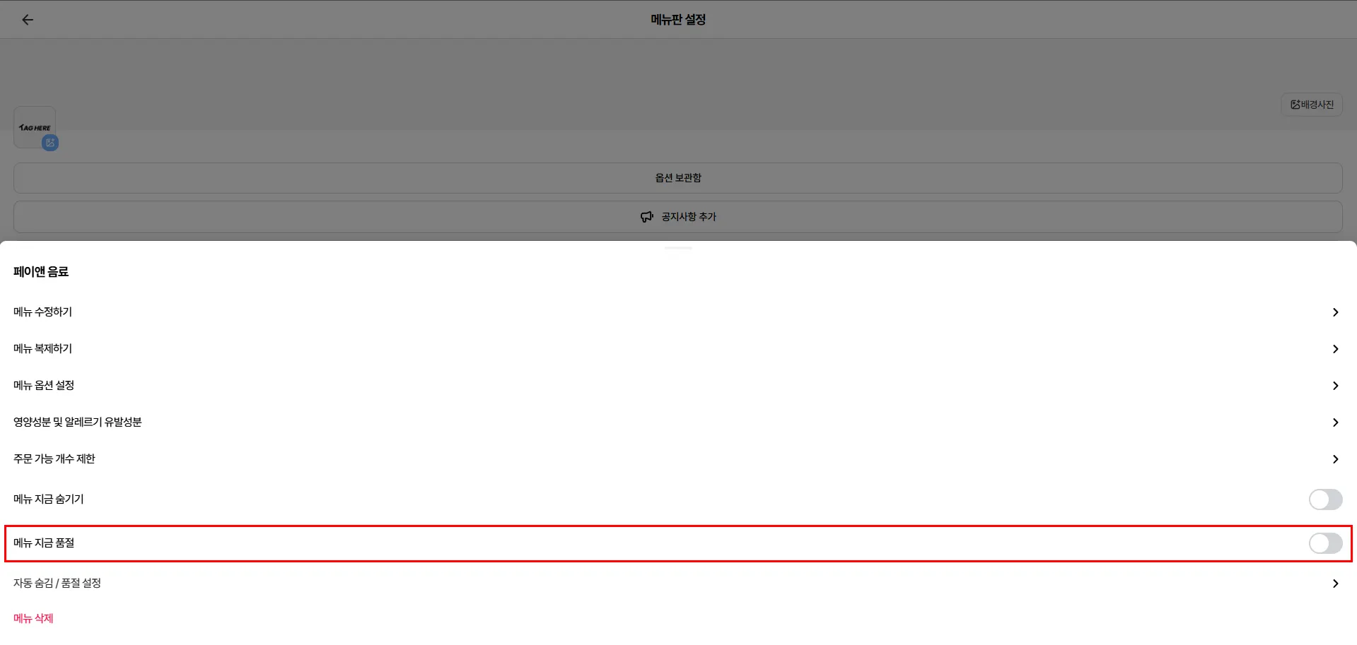 메뉴 지금 품절 : 선택한 메뉴를 태그히어에서 품절 처리해요.