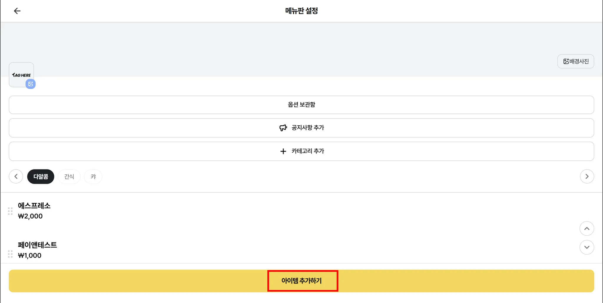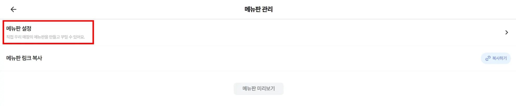 [메뉴판 관리] > [메뉴판 설정]을 눌러주세요.
