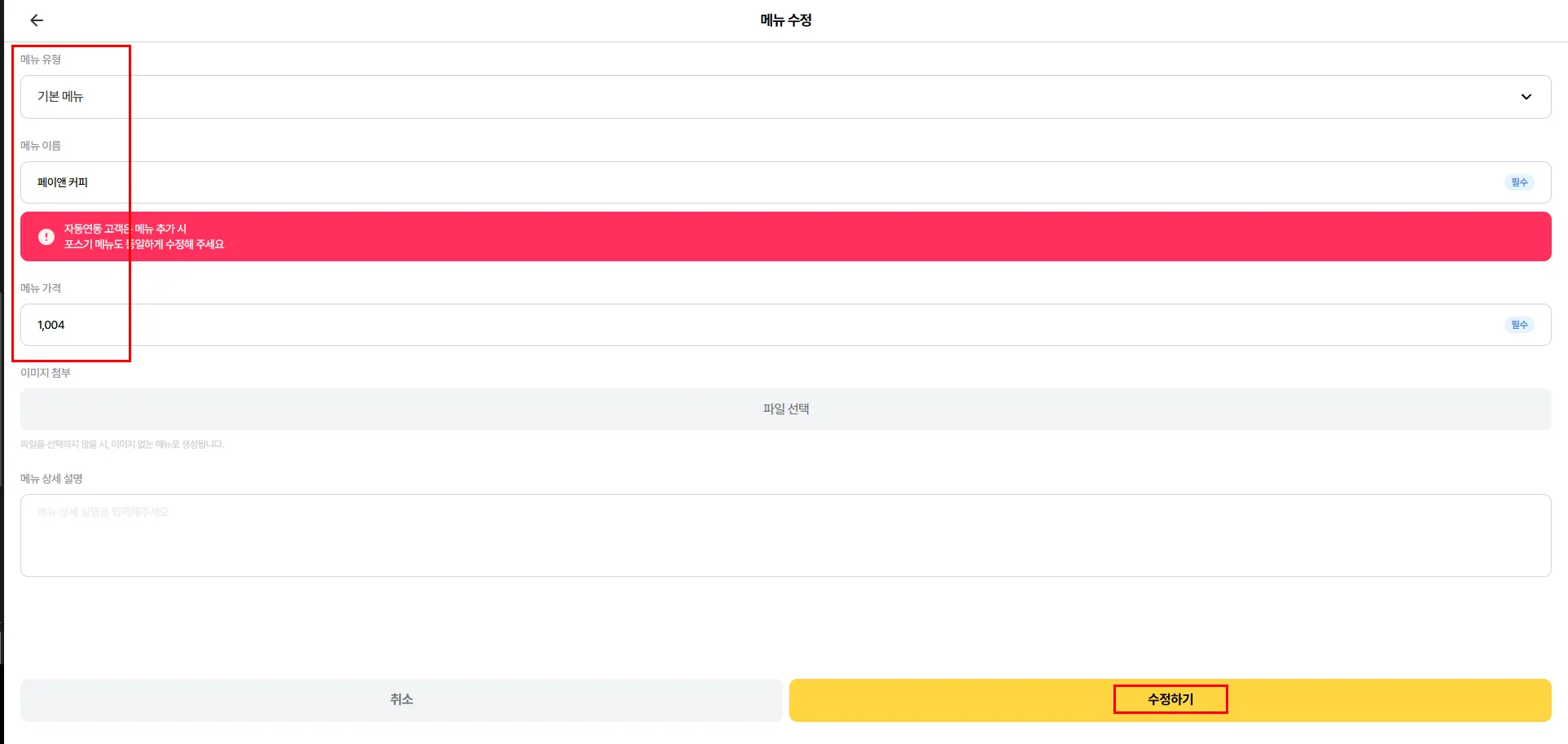 수정할 상품을 선택한 후, [메뉴 수정하기]를 눌러주세요.