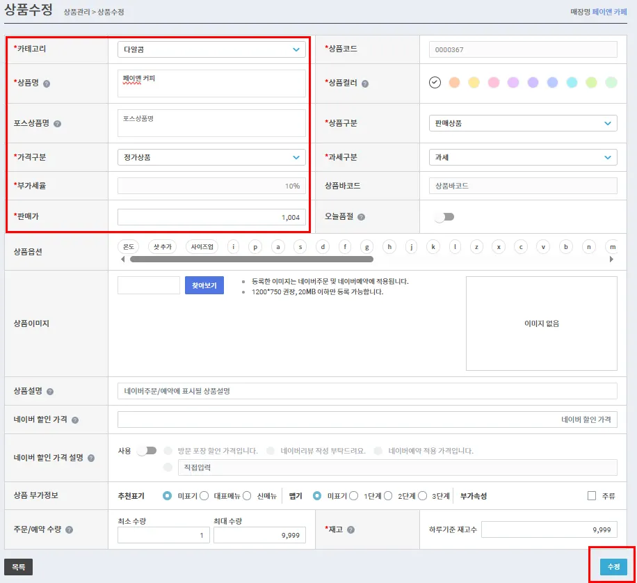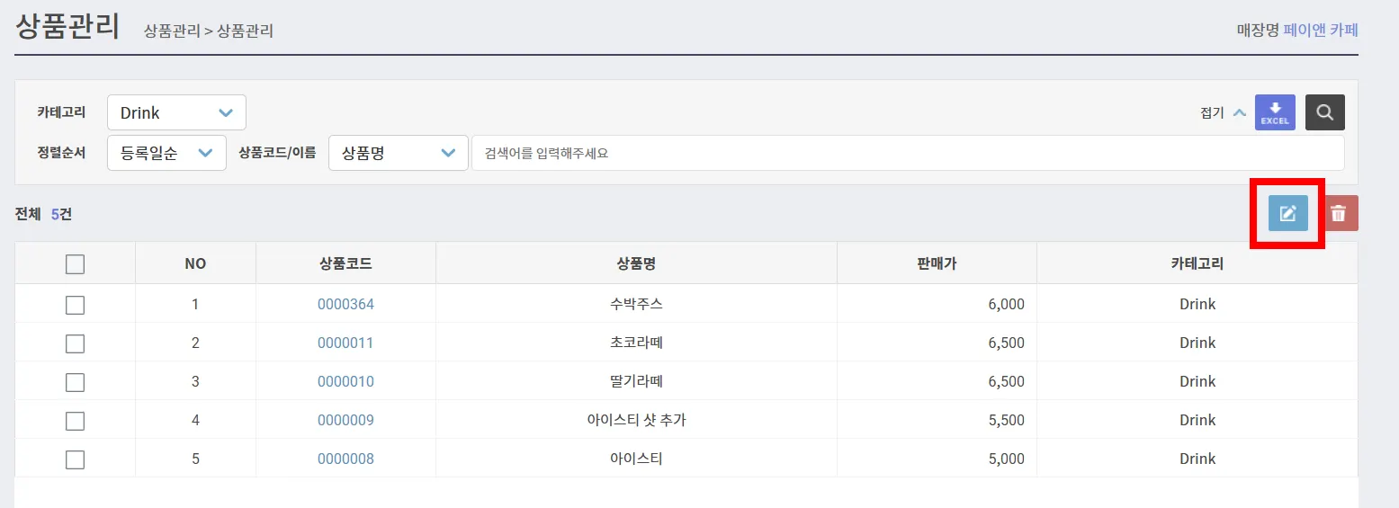 페이앤 사장님 페이지 내 [상품 관리]에서 수정할 상품의 [상품코드]를 눌러주세요. ex) 0000367