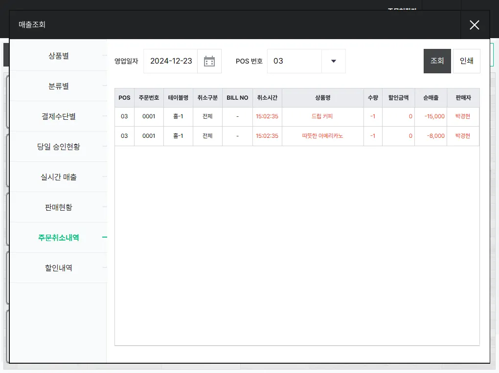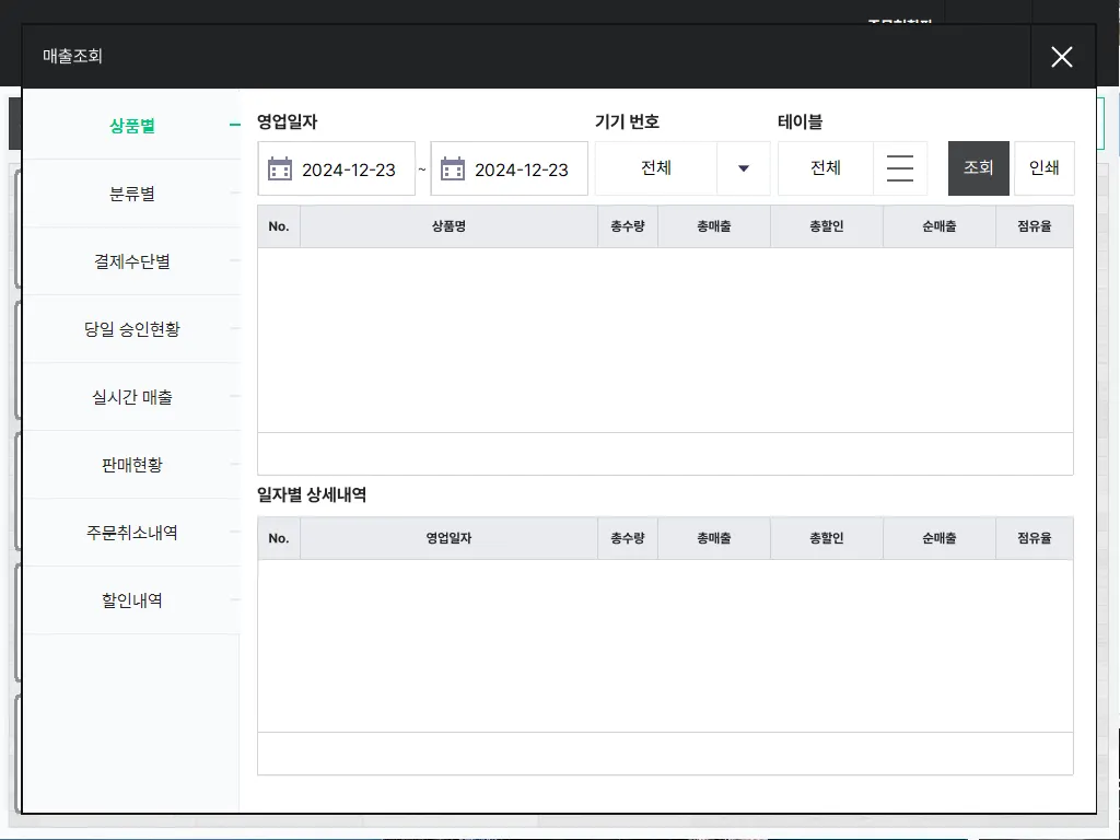[인쇄]를 누르면, 조회 시점까지의 당일 매출을 출력할 수 있어요.