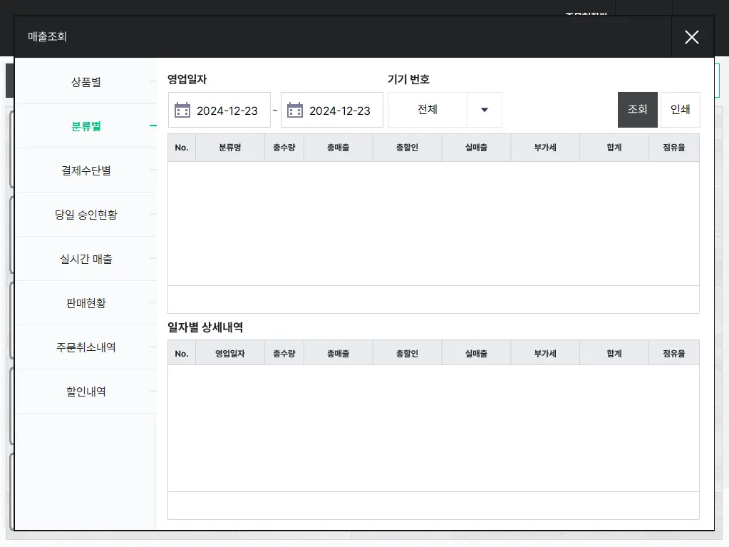 [☰] > [매출 조회] > [분류별]에서 분류별 매출을 확인할 수 있어요.
