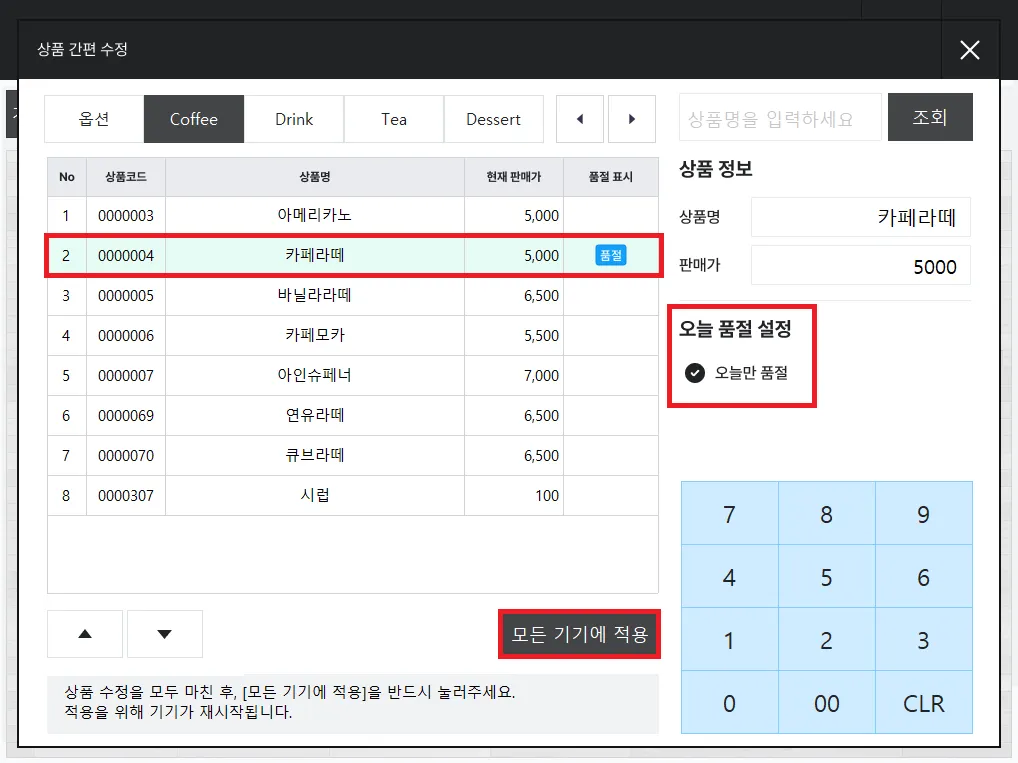 품절 처리할 상품을 선택한 후, [오늘만 품절]을 활성화 해주세요. ex) 카페라떼