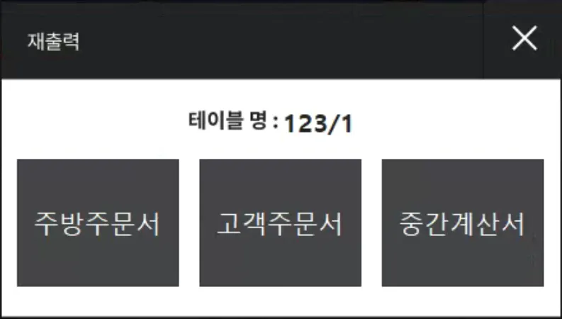 [재출력]에서 주문서 재출력이 필요한 테이블을 선택해 주세요.