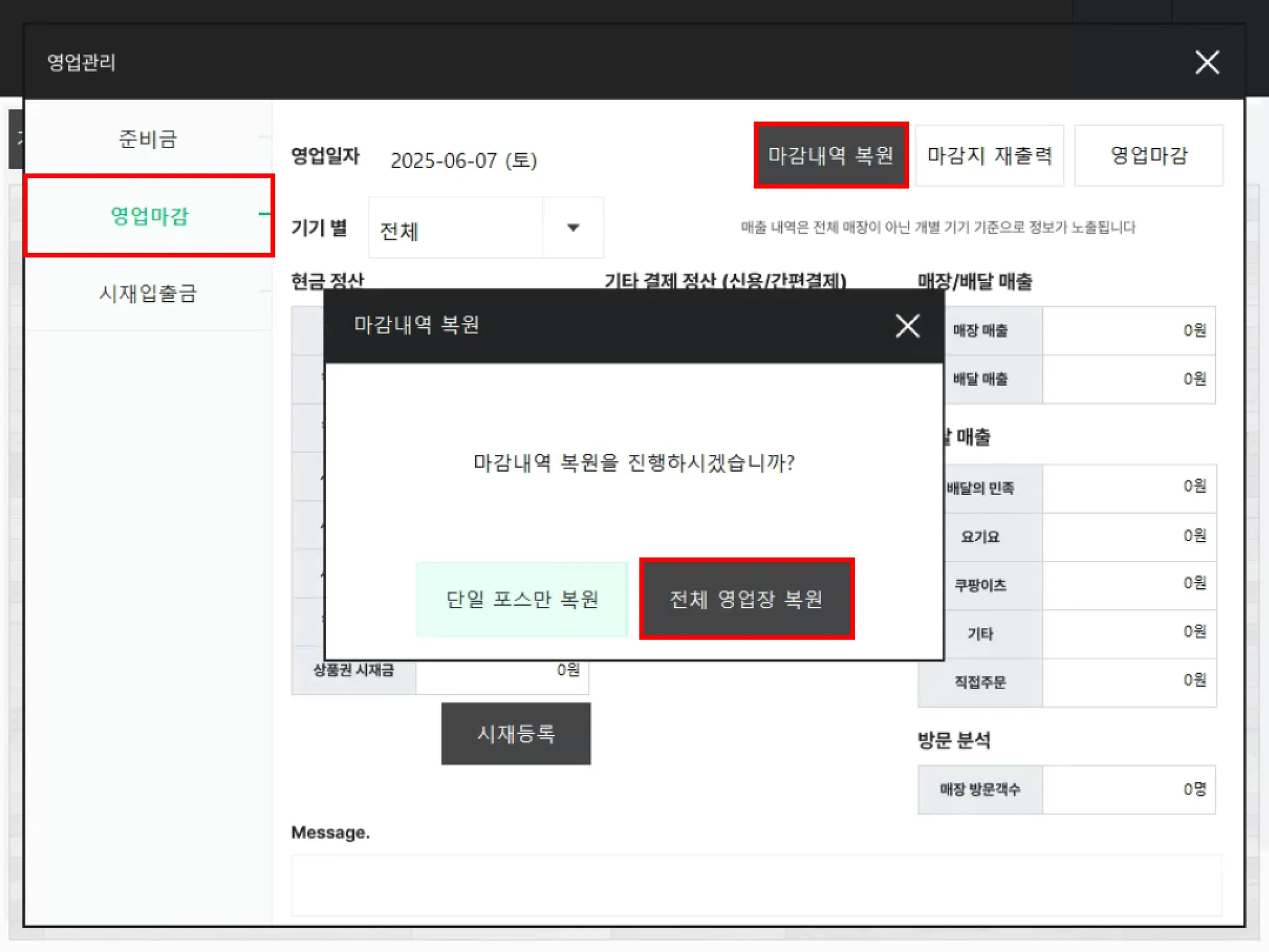[영업 마감] > [마감내역 복원]에서 [전체 영업장 복원]을 눌러주세요.•