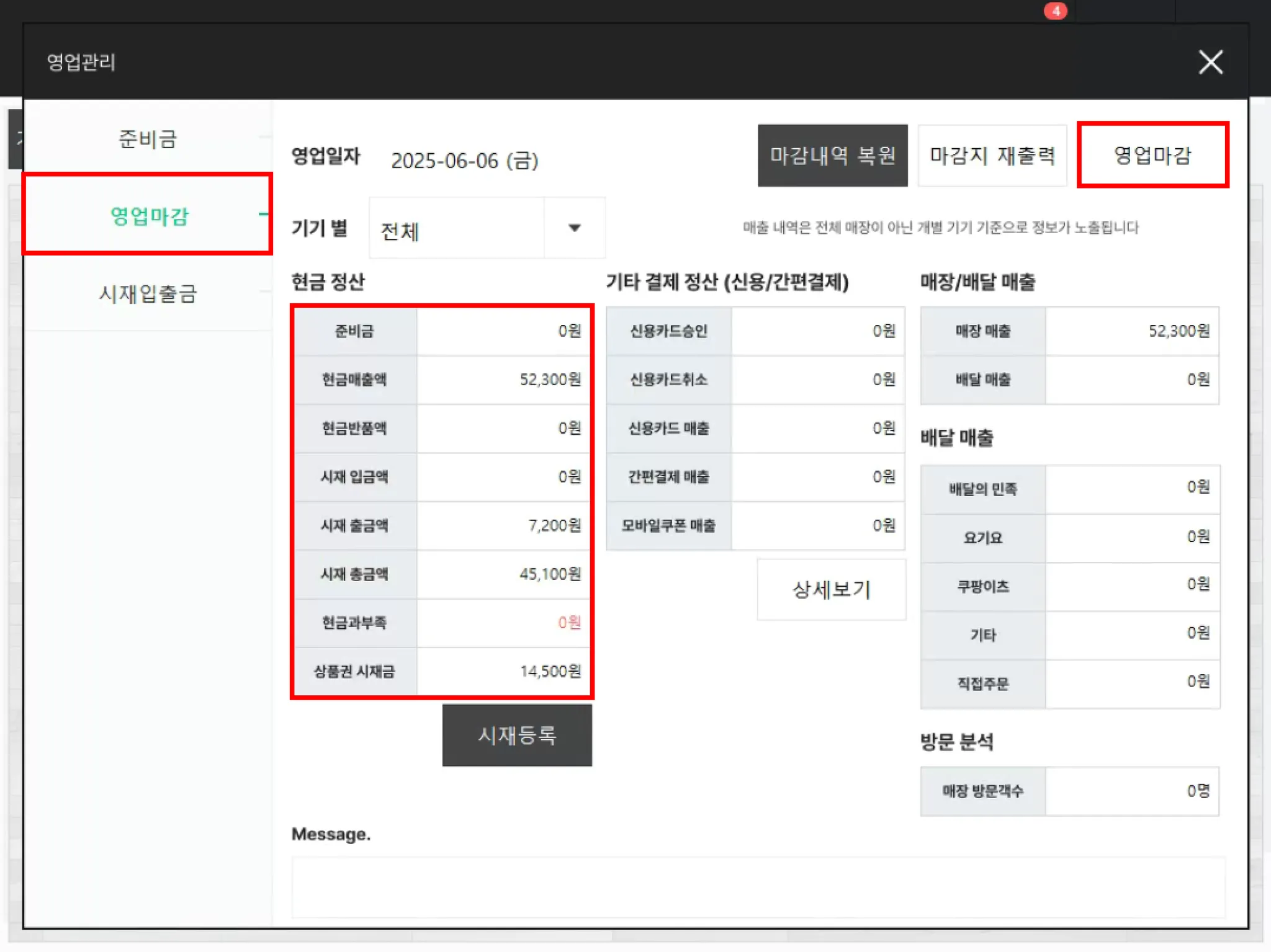 [영업 마감] > 현금 정산에서 [시재 등록]을 해주세요.