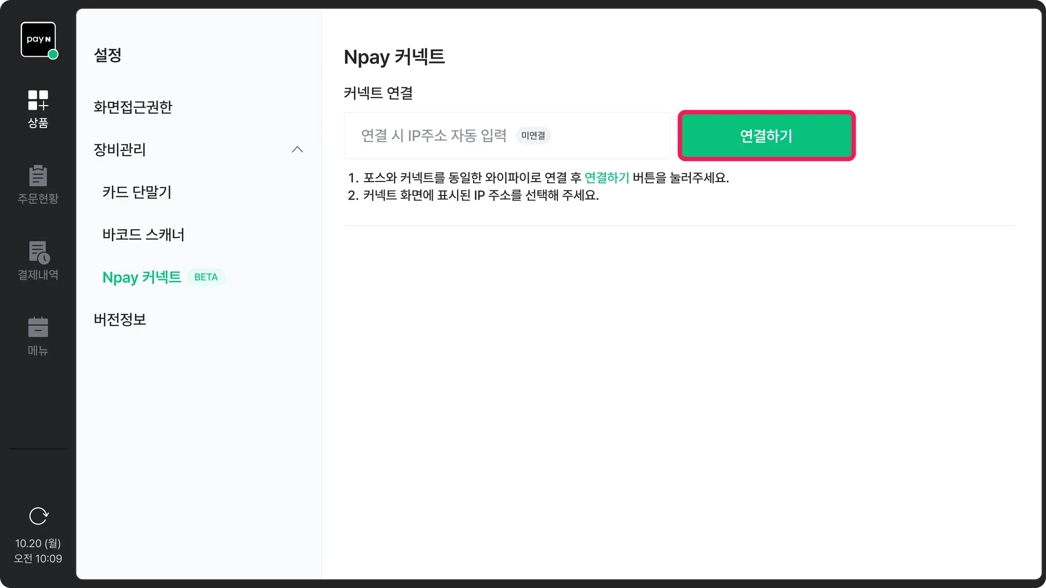 포스 내 [설정] > [Npay 커넥트]에서 [연결하기]를 눌러주세요.