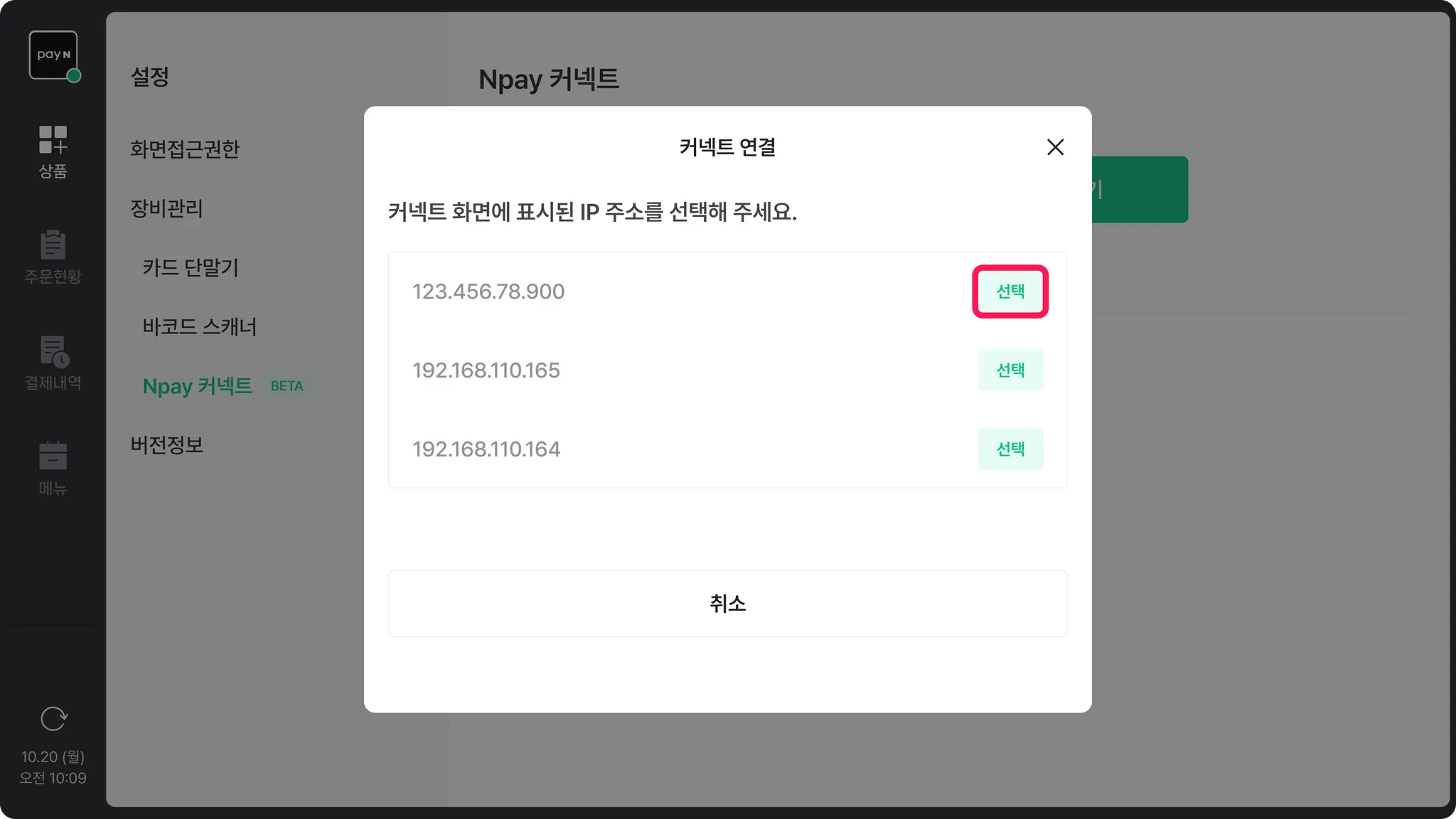 커넥트 화면에 표시된 IP 주소를 확인 후, 동일한 IP 주소를 [선택]해 주세요. ex) 123.456.78.900