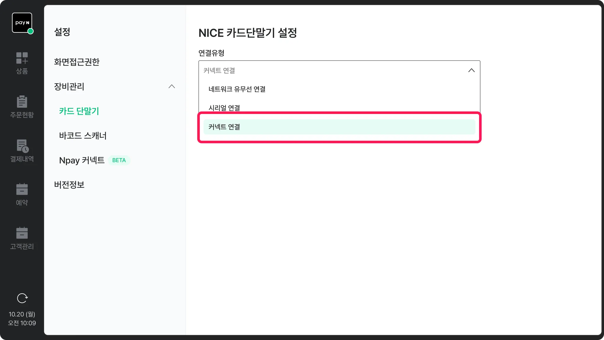 [장비관리] > [카드 단말기]에서 연결유형을 [커넥트 연결]를 눌러주세요.