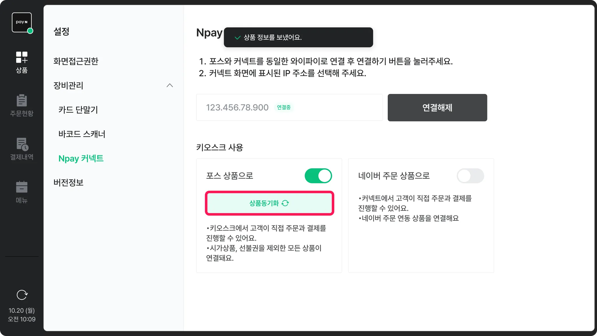 [Npay 커넥트] > [키오스크 사용]에서 원하는 모드를 선택한 후, [상품동기화]를 눌러주세요.•