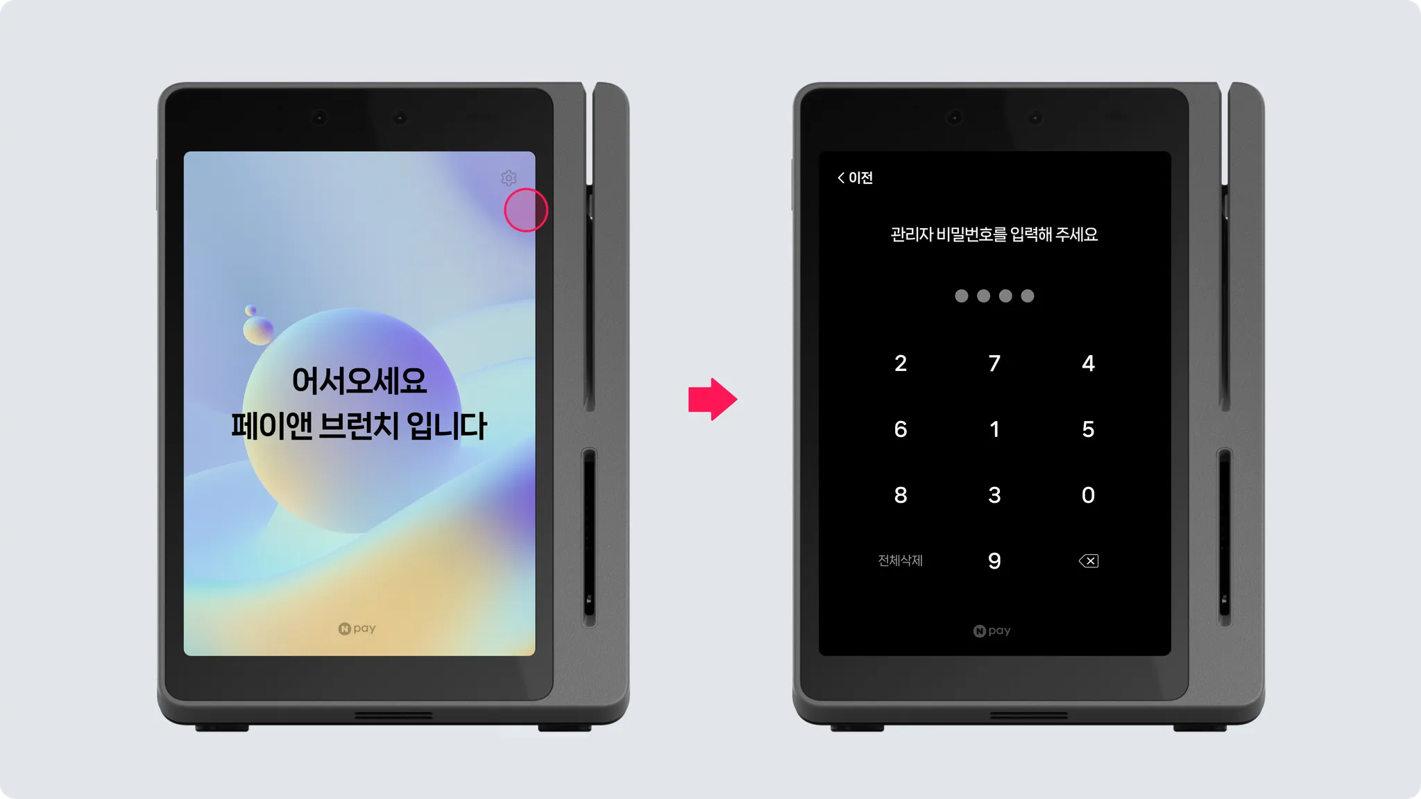 재부팅은 반드시 와이파이가 연결된 상태에서 진행해주셔야 해요.전원이 켜진 상태에서, Npay 커넥트 좌측 상단의 전원 버튼을 길게 눌러주세요.