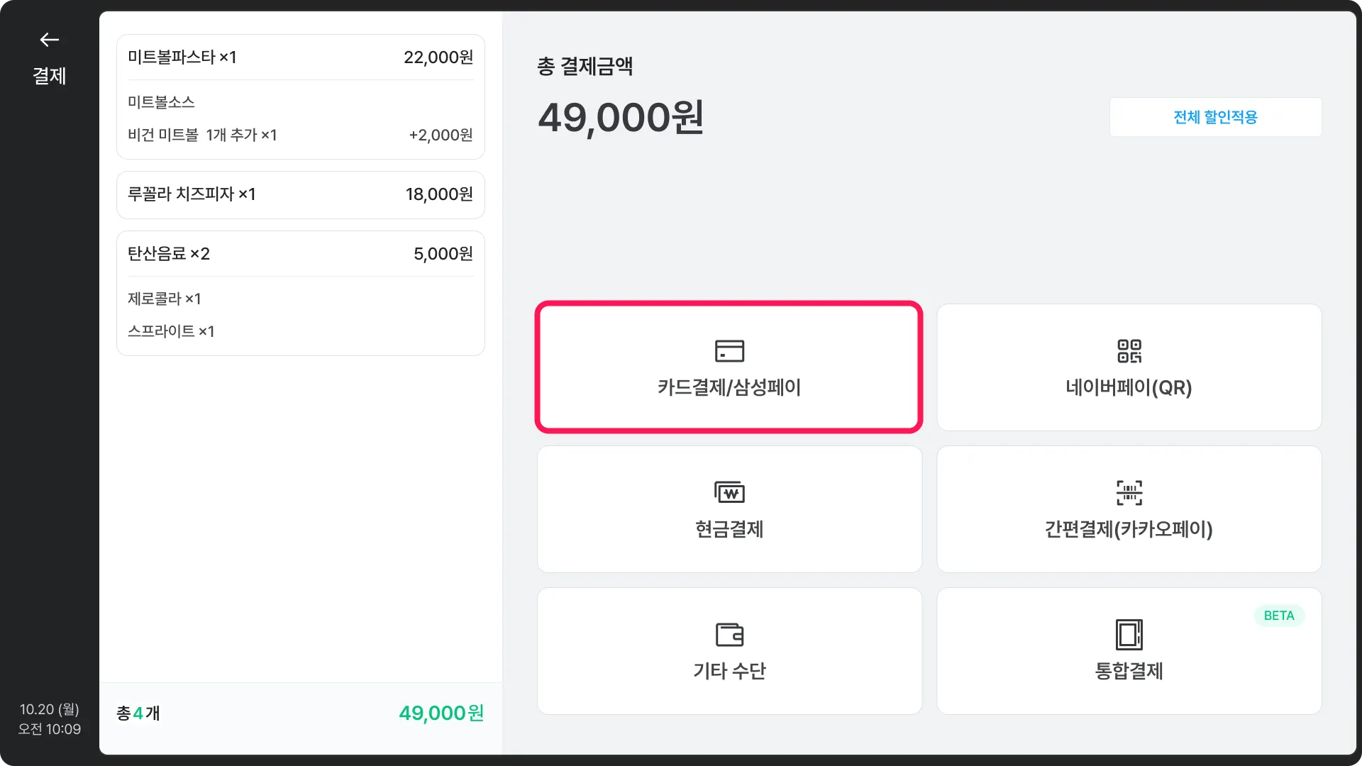 포스 결제화면에서 [카드결제 / 삼성페이]를 눌러주세요.