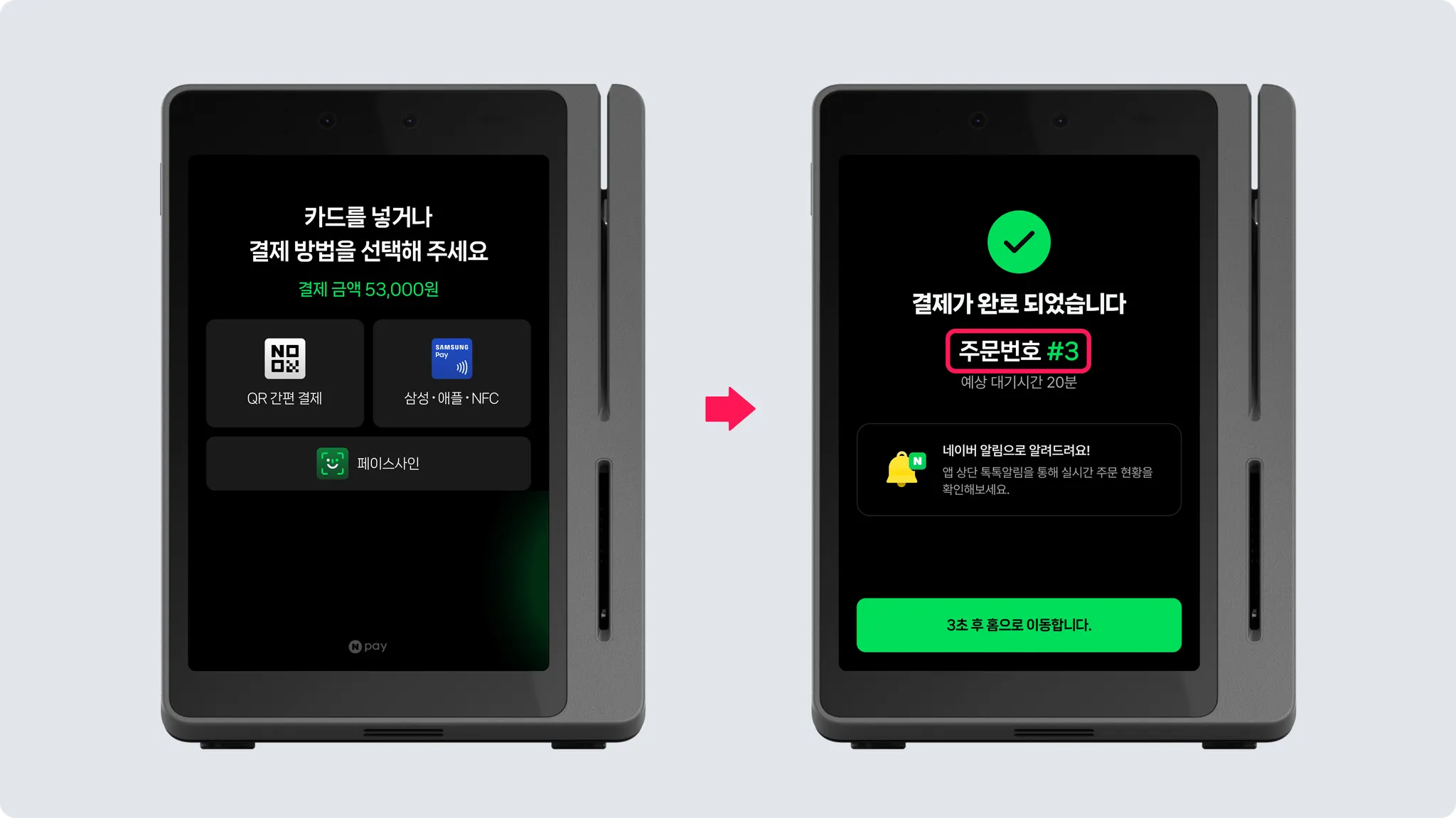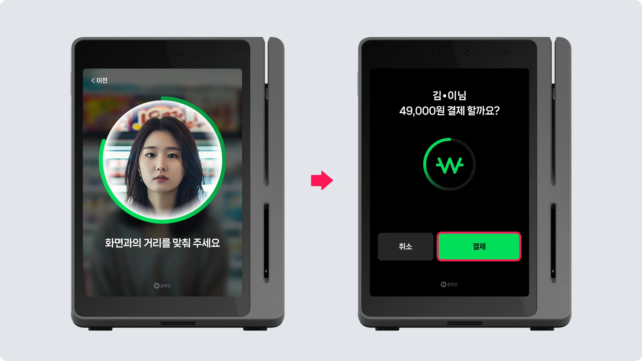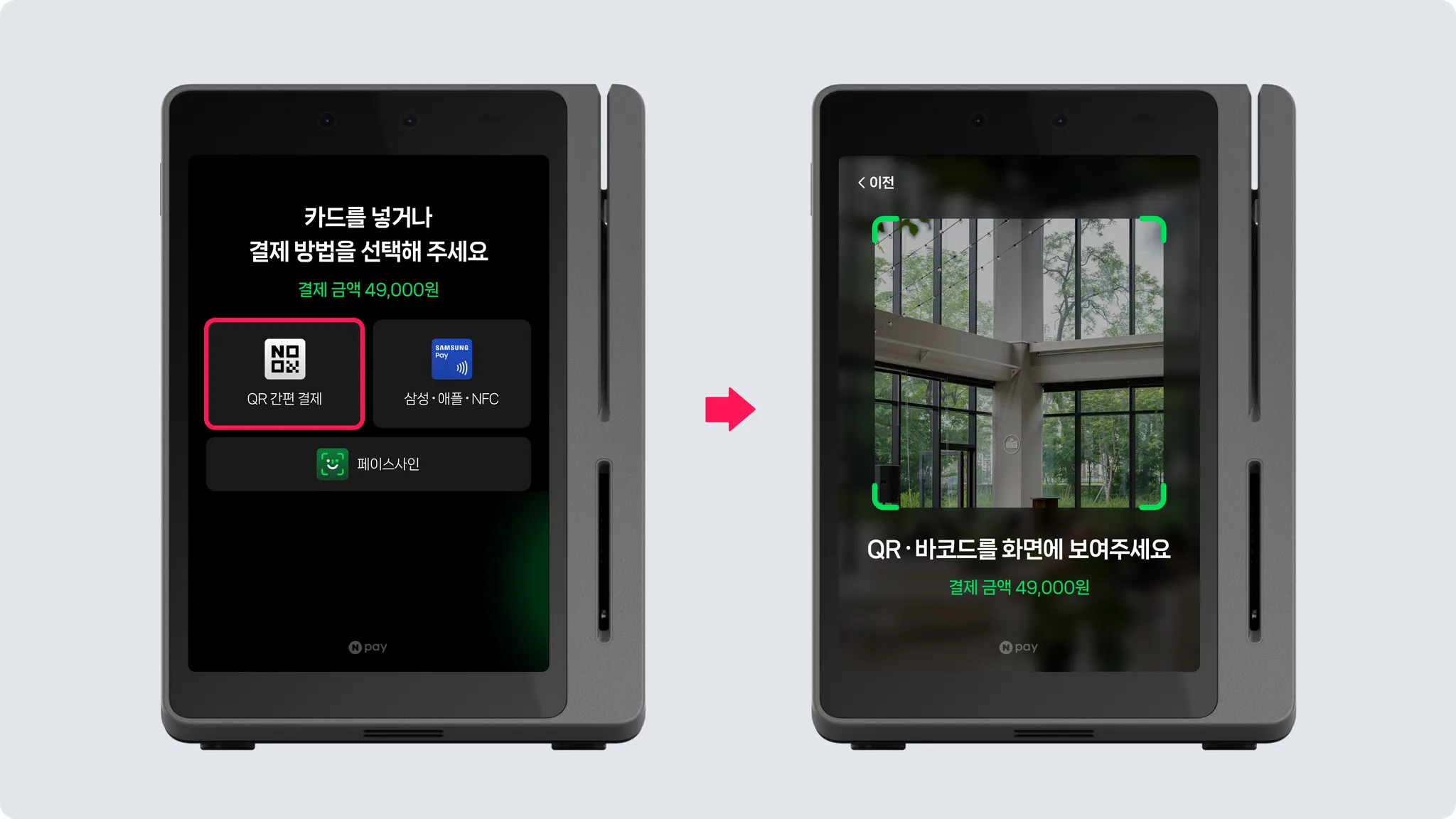 Npay 커넥트 화면을 보고 화면과의 거리를 맞춰주신 후, 인식이 완료되면 [결제]를 눌러주세요.사장님이 결제수단 선택