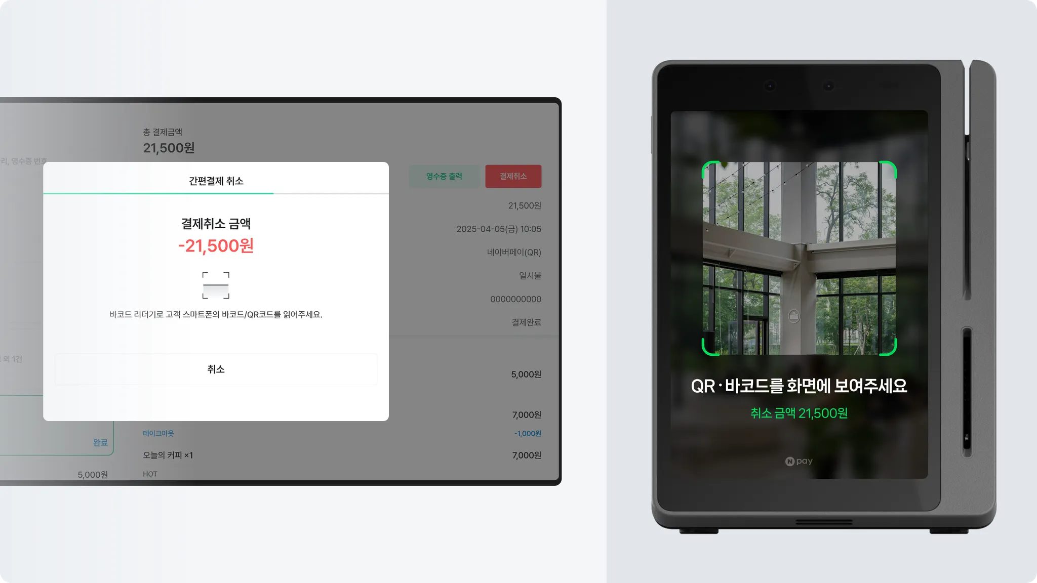 결제취소 금액을 확인한 후, QR 또는 바코드를 화면에 보여주세요.