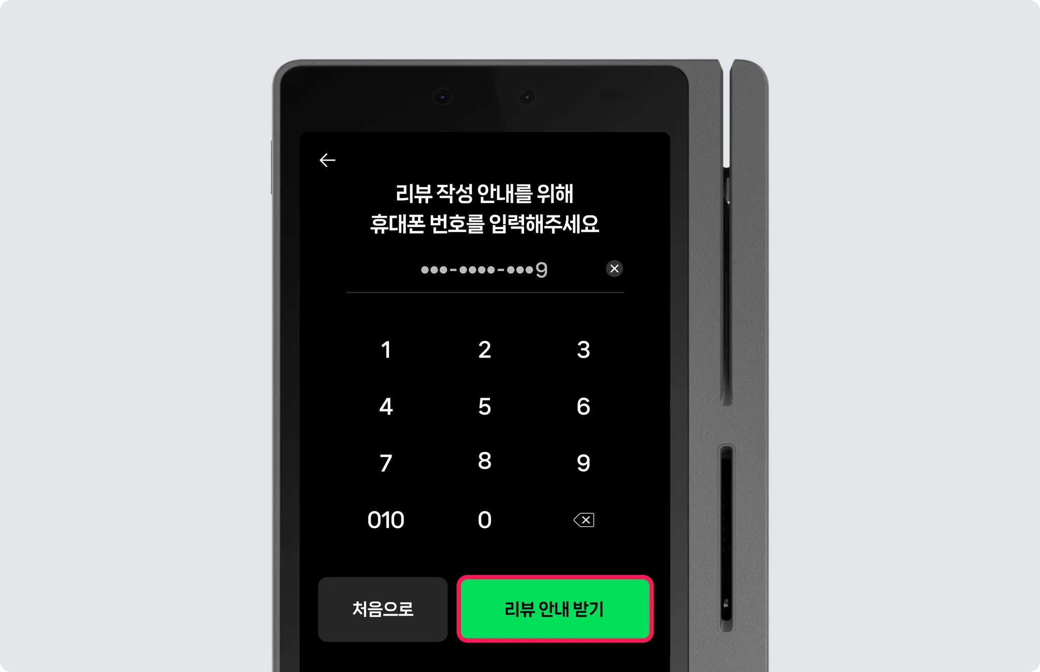 리뷰 작성 SMS 링크 문자를 받을 휴대폰 번호를 입력 후, [리뷰 안내 받기]를 눌러주세요.